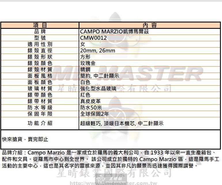 CAMPO MARZIO凱博馬爾茲 CMW0012 女錶以20mm與26mm方形玫瑰金錶殼呈現細緻比例,讓人一眼就記住它的低調質感。 星晴錶業深知這款商品不是最昂貴的選擇,但堅持以精鋼材質打造錶殼,務實呈現品牌對品質的承擔。 白色簡約面板配上中二針顯示,沒有華麗裝飾,卻以穩定和清晰完成每日讀時的責任。 選用強化型水晶玻璃,只為讓日常刮碰不輕易留下痕跡,這種細節是我們必須替您把關的地方。 搭配紅色真皮皮革錶帶,佩戴時輕盈柔軟,提醒使用者它的定位不是浮誇,而是可靠的陪伴。 內部使用頂級日本石英機芯,即使不是最高端配置,也能在穩定度上給人安心的依靠。 防水50米的設計並不炫耀性能,而是讓日常洗手或遇雨時不用多想,務實應對生活。 全球保固2年,是星晴錶業對這件商品的承諾,希望您知道我們願意替這款錶負責到底。 整體重量超級輕巧,佩戴整天也無負擔,體現我們對配戴舒適度的使命感。 它不是最完美,但每個部件—from錶殼到錶帶—都盡力做到品質精良,只為讓您買到一款值得信任的女錶。