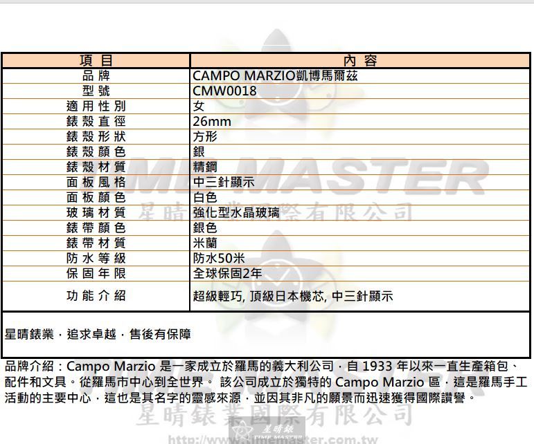 CAMPO MARZIO凱博馬爾茲 CMW0018 26mm 女錶以務實設計為主軸,讓您一眼看見方形銀色精鋼錶殼的清爽質感。 這款石英機芯雖不是市面上最奢華的配置,但穩定度與耐用度始終是它最踏實的承諾。 中三針白色面盤的畫面乾淨俐落,強化型水晶玻璃在日常碰撞中提供安心守護。 米蘭銀色錶帶以細膩工法打造,即使長時間佩戴也能保持舒適貼合。 超級輕巧的特性讓它在手腕上幾乎沒有負擔,適合每天肩負多項角色的您。 頂級日本機芯雖低調,卻以穩定走時默默支撐整天的步調。 防水50米的防護力不是誇張的數據,但足以陪伴日常洗手與偶遇雨滴的情況。 全球保固2年的保障,給您一種務實卻可靠的後盾。 這款錶的價格雖不是最低,但反映的每一分都是品質與細節的踏實投入。 星晴錶業以使命感呈現這只 CAMPO MARZIO 女錶,希望為您帶來一件能信任、能日用、能陪伴的貼心選擇。