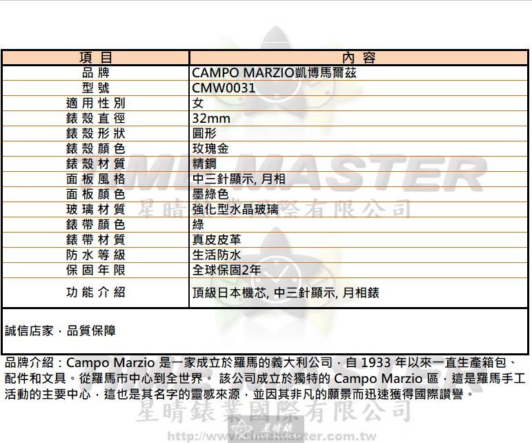 CAMPO MARZIO凱博馬爾茲CMW0031女錶,錶殼直徑32mm,玫瑰金精鋼打造,呈現低調優雅氣質,雖非最便宜,但品質精良,讓您安心佩戴每一天。 佩戴CMW0031,墨綠色面板搭配月相顯示,細膩呈現時間的流轉感,石英機芯精準穩定,價格合理卻兼具實用性。 真皮綠色錶帶與圓形錶殼完美呼應,觸感柔軟舒適,雖非頂級奢華,但每個細節都經過認真打磨。 強化型水晶玻璃面板耐磨抗刮,生活防水設計讓日常使用更無負擔,品質與價格平衡,是務實選擇。 CMW0031女錶以頂級日本機芯為核心,提供穩定精準的時間掌控,讓佩戴者感受到品牌肩負的責任感。 中三針顯示結合月相功能,呈現細膩時間美感,雖非最華麗,但實用與優雅兼具,是細心的選擇。 全球保固2年,售後服務完善,雖價格不算低,但品質保證,為每一位使用者提供安心佩戴體驗。 星晴錶業嚴選精鋼錶殼與真皮錶帶,堅持耐用與舒適,價格合理中展現品牌對品質的承諾。 CMW0031女錶設計細膩,適合日常與正式場合佩戴,雖非市場最頂級,但每個細節都兼顧實用與美感。 選擇CAMPO MARZIO凱博馬爾茲CMW0031,是對務實生活的肯定,價格與品質兼顧,肩負時間管理的使命感。