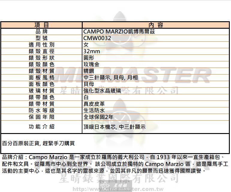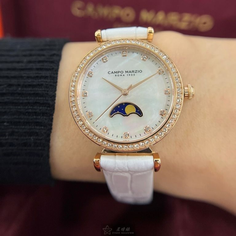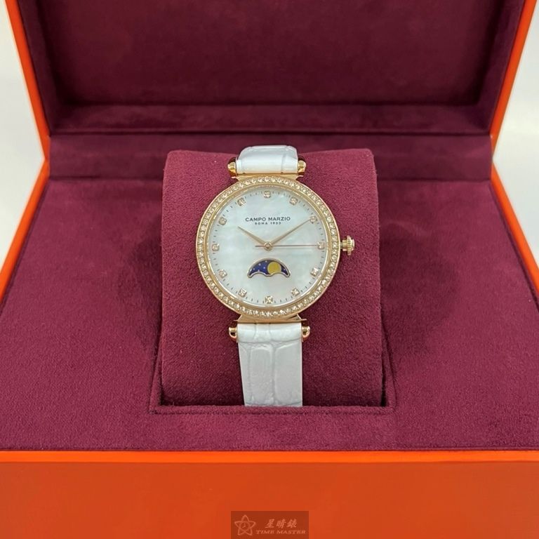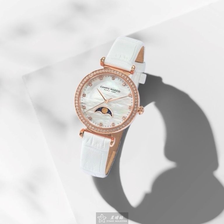CAMPO MARZIO凱博馬爾茲 CMW0032 女錶,錶殼直徑32mm,圓形玫瑰金精鋼材質,精緻而不張揚,展現日常優雅風格。 貝母面板搭配月相設計,中三針顯示清晰易讀,細膩的工藝讓每一次看時間都成為享受。 搭載頂級日本石英機芯,提供穩定且精準的走時表現,雖非頂級機械錶,但耐用可靠,值得信賴。 白色真皮錶帶柔軟貼合手腕,兼具舒適與質感,日常佩戴中展現低調的品味。 強化型水晶玻璃面板,抗刮耐用,雖不能完全避免磕碰,但已經提供充分的生活保護。 生活防水設計,應對日常洗手或小雨毫無壓力,讓手錶隨你日常活動自如應對。 全球保固2年,星晴錶業承諾售後服務,讓購買這只錶不只是交易,而是一份安心保障。 價格雖不是市場最低,但每一處細節皆經過精心打造,品質精良,讓你以合理價格擁有長久陪伴。 設計風格低調務實,肩負讓每位女性日常佩戴都優雅自信的使命感,不只是裝飾,更是生活伴侶。 CMW0032女錶兼顧功能與美感,適合追求細膩與實用的你,將每一次抬腕看時間都化為平凡中的儀式感。