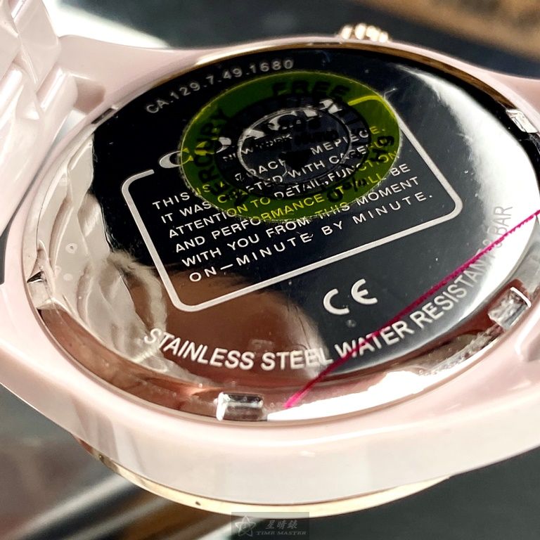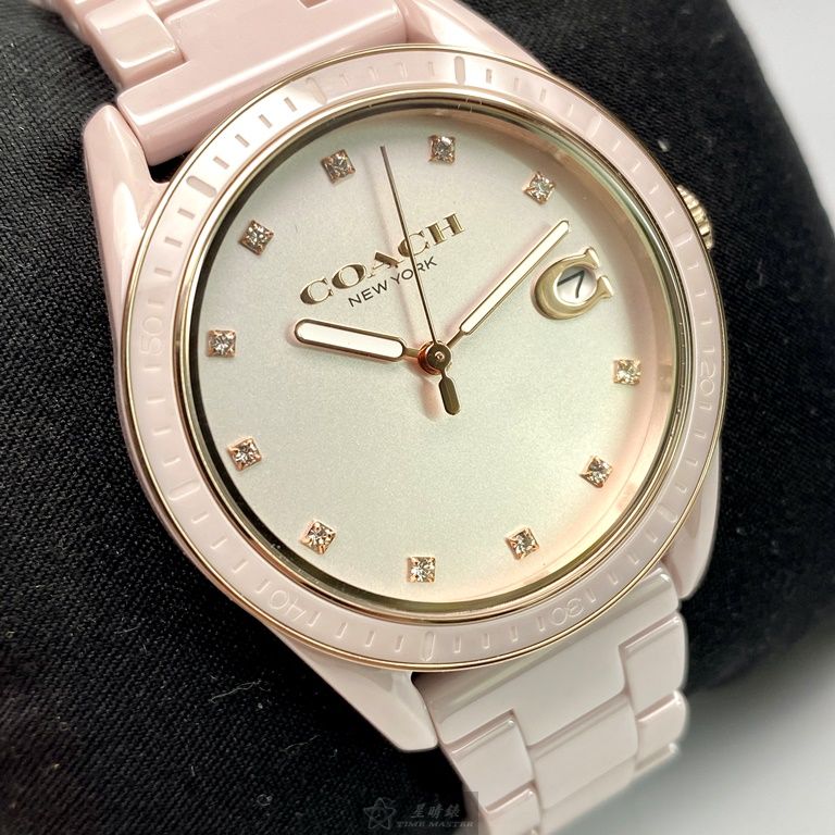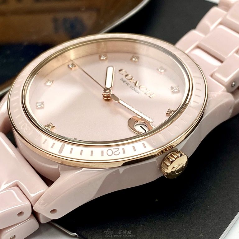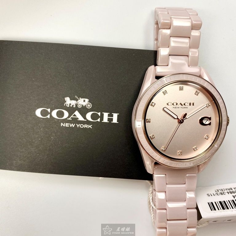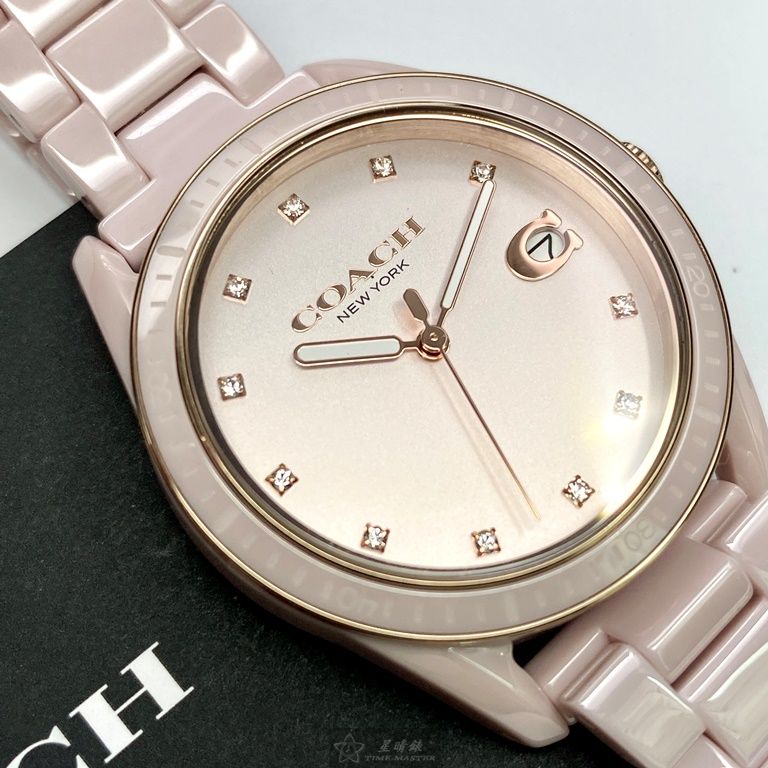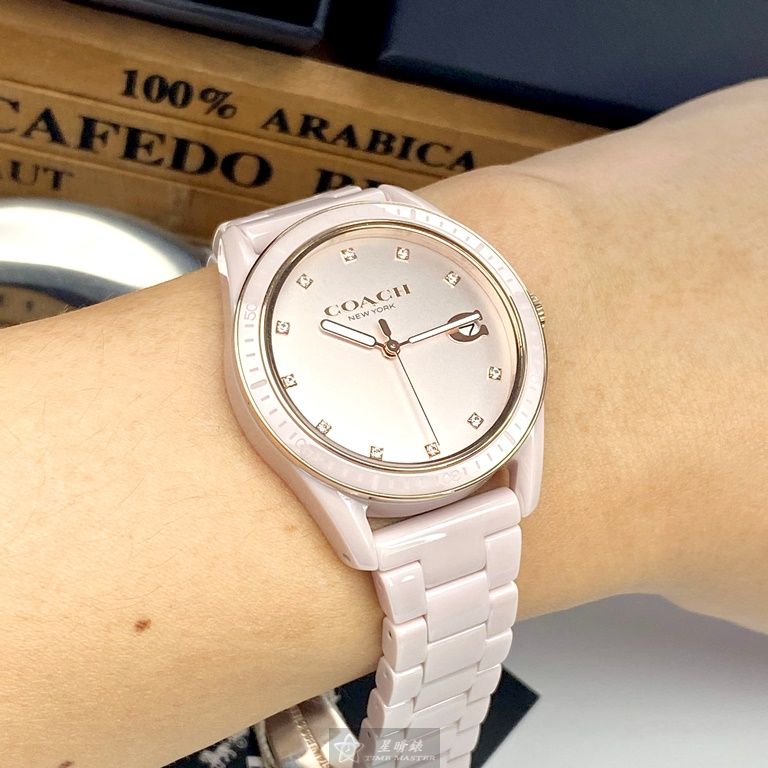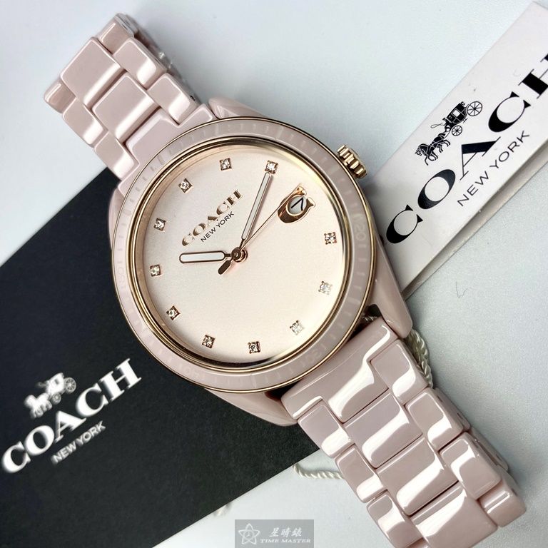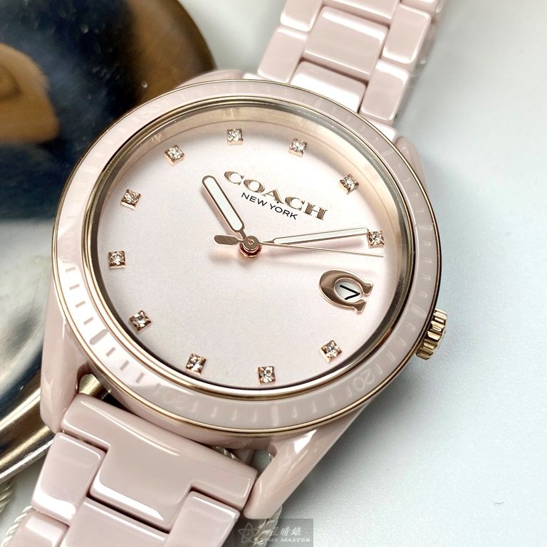COACH手錶,編號CH00022,36mm粉色圓形陶瓷錶殼,粉色簡約錶面,粉紅陶瓷錶帶款,頂級時尚!