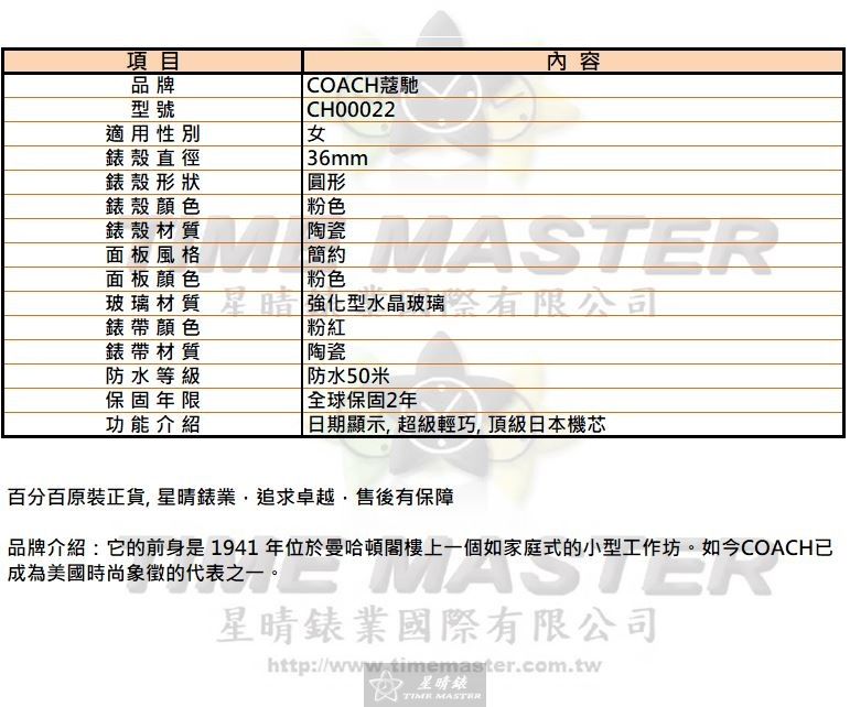 COACH蔻馳 CH00022 36mm女錶以星晴錶業嚴選的標準呈現,雖非奢華頂規,但以務實的陶瓷質感與輕巧結構承擔起每日可靠的時間使命。 這只圓形粉色陶瓷錶殼以細膩手感傳達品牌堅持,不追求浮誇,反而提供耐磨耐看的扎實陪伴。 粉色簡約面板在光下呈現柔和層次,讓日常穿搭不需刻意點綴也能有自然亮點。 強化型水晶玻璃雖非最昂貴材質,但能有效提升耐刮性,對日常通勤或外出更為實用。 粉紅陶瓷錶帶帶來清爽佩戴感,價格不是最低,但材質穩定、色澤細膩,讓長時間佩戴更輕鬆。 內建頂級日本石英機芯,定位務實精準,不炫技,卻能默默為每一天保持穩定節奏。 日期顯示功能雖小,但在忙碌時提供剛剛好的便利,是日常生活最貼心的助手。 50米防水等級讓它能應付生活中的潑水與雨滴,不鼓吹極限,但完成日常保護的責任。 全球保固2年象徵品牌對品質的承擔,讓消費者能安心享受使用過程。 這款女錶並非標榜完美,而是以務實品質、可靠材質與親切價格,肩負起陪伴妳生活節奏的任務。
