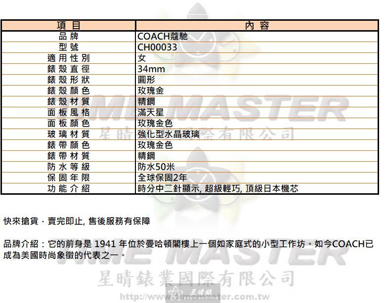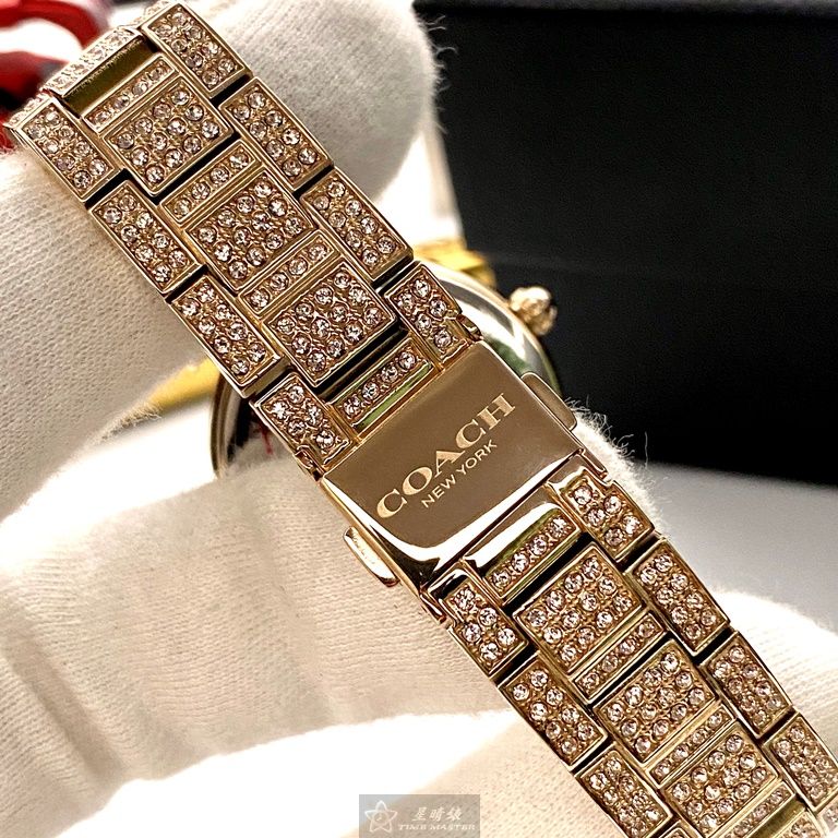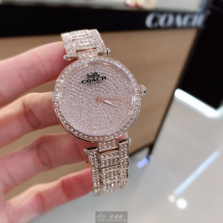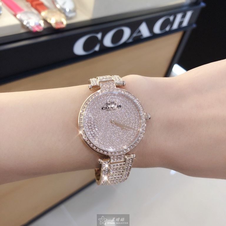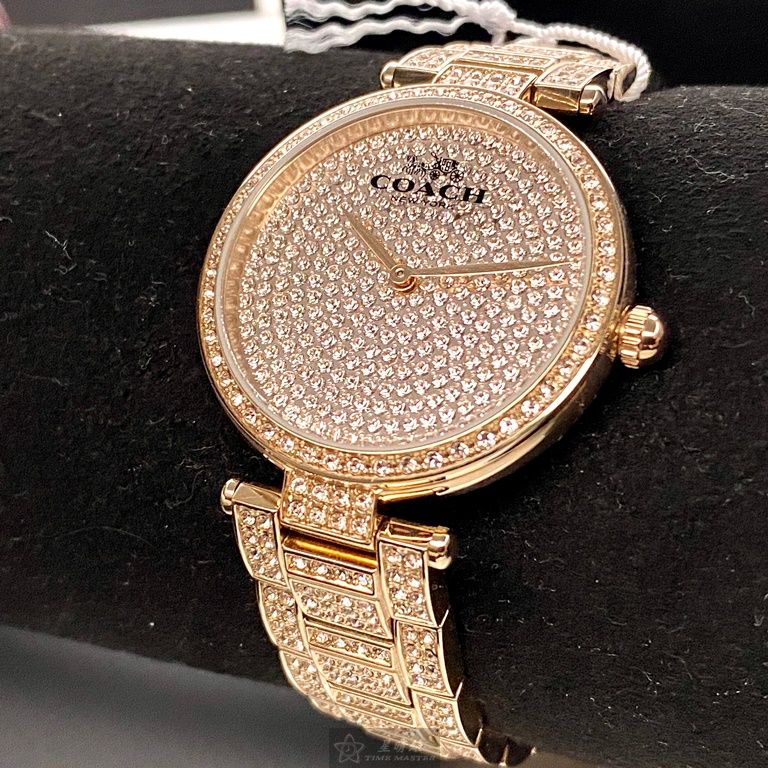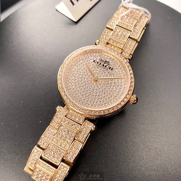 COACH手錶,編號CH00033,34mm玫瑰金圓形精鋼錶殼,玫瑰金色滿天星錶面,玫瑰金色精鋼錶帶款