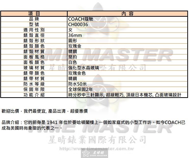 COACH蔻馳 CH00036 36mm 女錶以玫瑰金精鋼打造,星晴錶業以務實態度呈現這款並非完美但值得信賴的日常好物。 這只石英機芯手錶以簡約白色面板搭配三針顯示,專注於清晰閱讀而不是浮誇設計。 強化型水晶玻璃與凸面造型相結合,帶來溫潤觸感,也展現出品牌對細節的基本堅持。 玫瑰金精鋼錶帶不追求奢華,而是帶來耐用度與穩定佩戴感,是日常陪伴的可靠選擇。 頂級日本機芯雖不是市場上最昂貴的配置,但以穩定與省心著稱,適合作為長期使用的夥伴。 防水50米的規格務實不誇大,足以應付生活中的基本用水情境,不讓你在日常行程中分心。 全球2年保固彰顯品牌的責任感,讓你購買的不只是商品,而是後續被好好照顧的承諾。 圓形36mm錶殼比例溫柔耐看,在工作或休閒場合都能自然融入你的節奏而不搶戲。 這款女錶強調不是最便宜,但用料與質感都經得起比較,讓你付出的是值得的品質。 星晴錶業以賣錶為使命,把這只蔻馳 CH00036 當成一份可靠交付,陪伴你每天踏實前行。