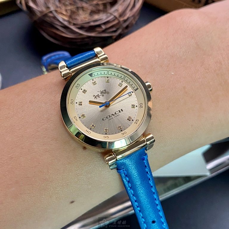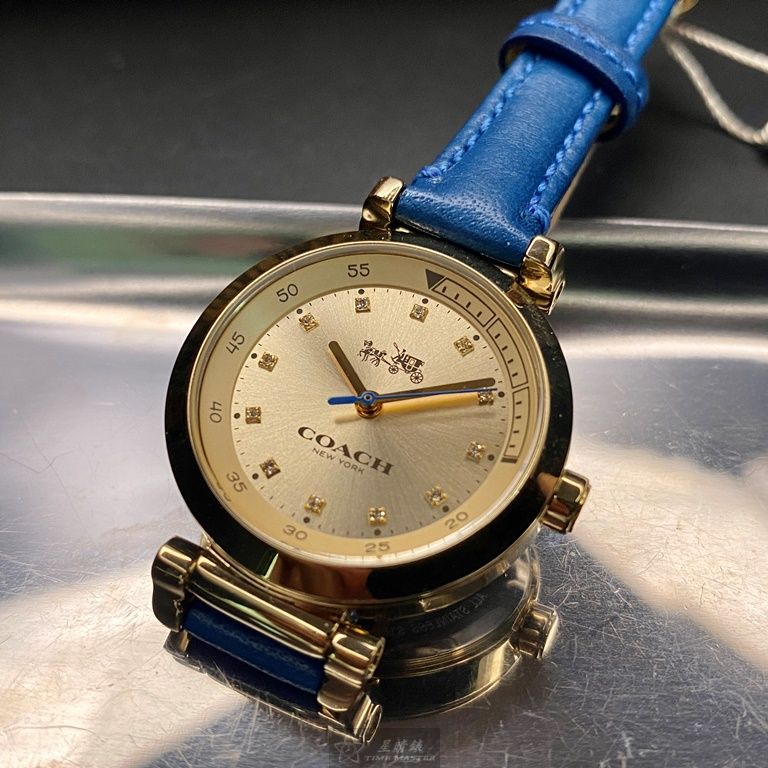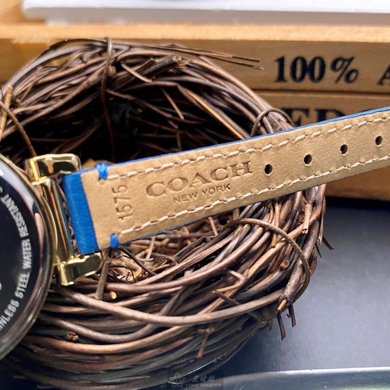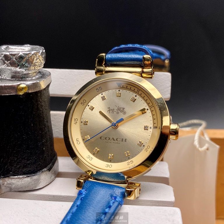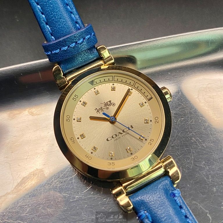 COACH手錶,編號CH00047,30mm金色圓形精鋼錶殼,金色簡約錶面,寶藍真皮皮革錶帶款