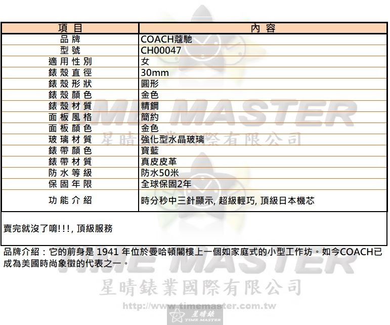 COACH蔻馳 CH00047 女錶 30mm,以精鋼金色圓形錶殼搭配寶藍真皮錶帶,石英機芯提供穩定走時,雖非最便宜,但每一只都是星晴錶業用心打造的精良之作。 錶面簡約金色設計搭配強化型水晶玻璃,清晰易讀,日常佩戴與正式場合皆適合,價格合理卻保證細膩品質。 頂級日本石英機芯支持時分秒三針顯示,確保時間準確,讓佩戴者感受到小巧腕錶背後的可靠力量。 30mm圓形錶殼設計兼顧優雅與輕盈,寶藍真皮錶帶柔軟貼手,給予日常配戴舒適感,價值超越價格的直觀體驗。 防水50米功能,適合日常生活防潑水需求,雖非專業潛水錶,但每一次使用都彰顯星晴錶業對品質的堅持。 精鋼錶殼經過細緻打磨,散發低調光澤,與金色錶盤互相呼應,呈現出實用與美感兼具的細膩感受。 真皮錶帶耐用且易於保養,即使長時間佩戴,也能保持舒適與耐看,雖價格略高,卻值得信賴。 全球2年保固讓購買無後顧之憂,星晴錶業以使命感肩負每只腕錶的品質責任,讓每位女性佩戴安心。 超輕巧設計適合長時間佩戴,無負擔感,實用而不浮誇,是日常與特殊場合兼備的實際選擇。 COACH蔻馳 CH00047 女錶雖非市場最便宜,但精選材質與精良工藝讓它在品質上無可挑剔,是理性消費與美感兼顧的細膩之選。