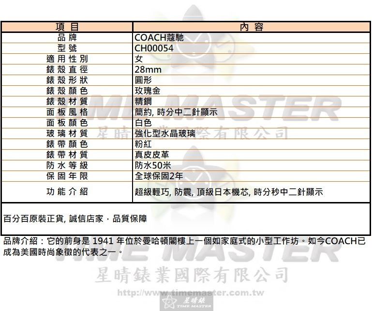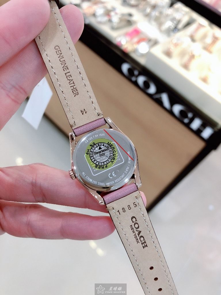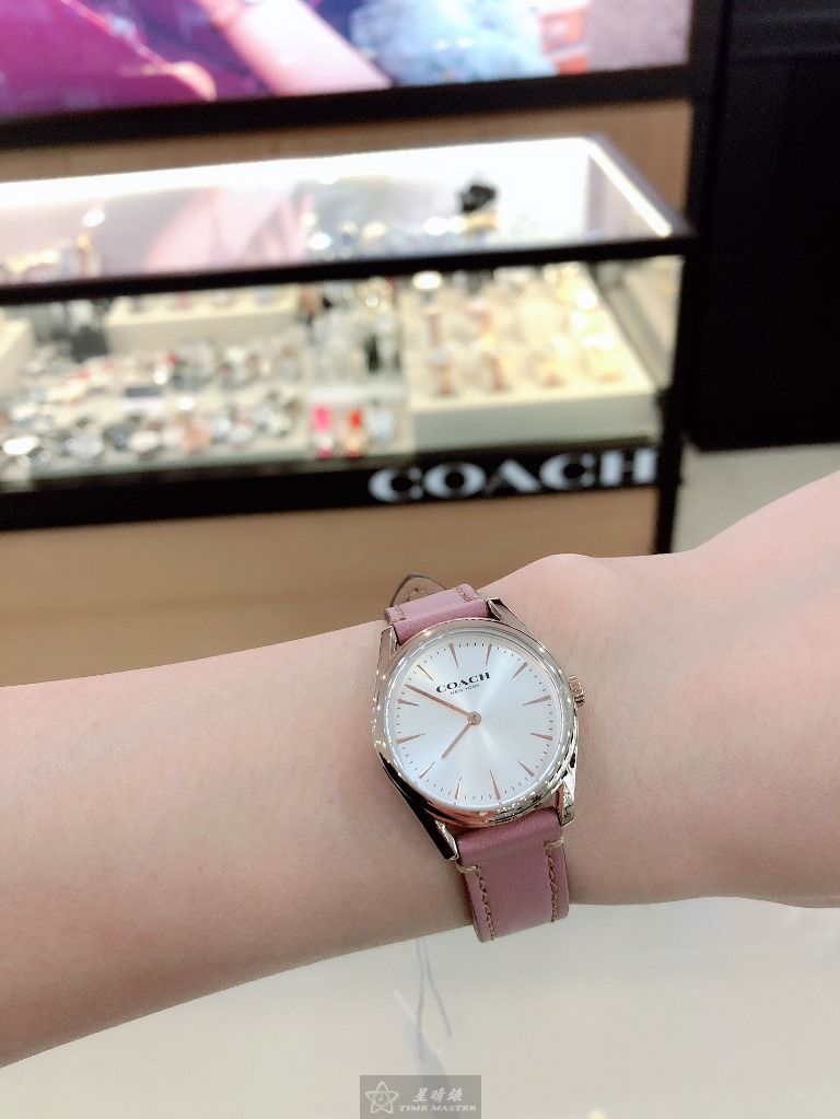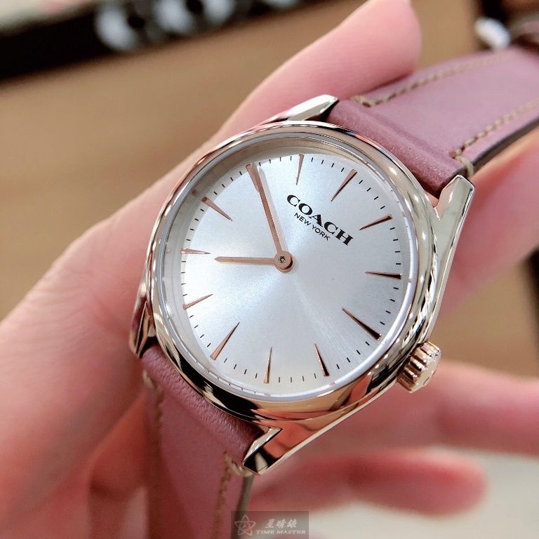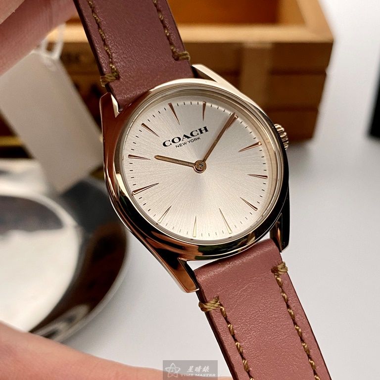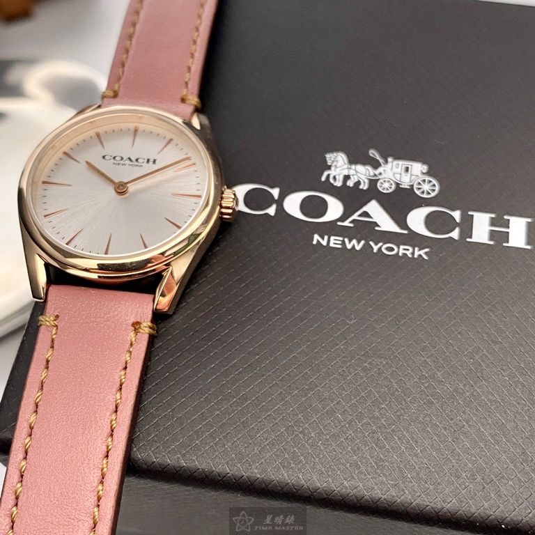 COACH手錶,編號CH00054,28mm玫瑰金圓形精鋼錶殼,白色簡約, 時分中二針顯示錶面,粉紅真皮皮革錶帶款