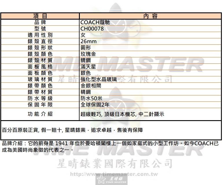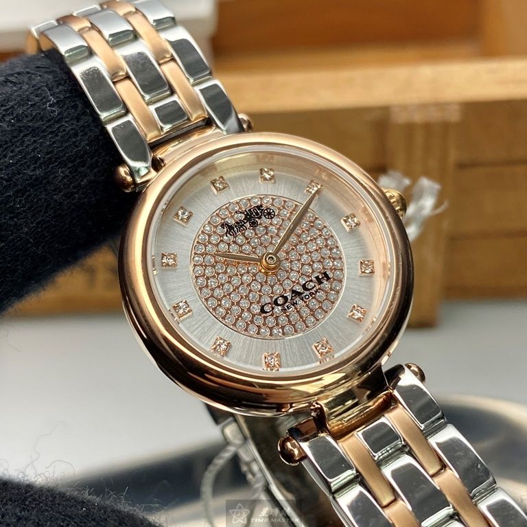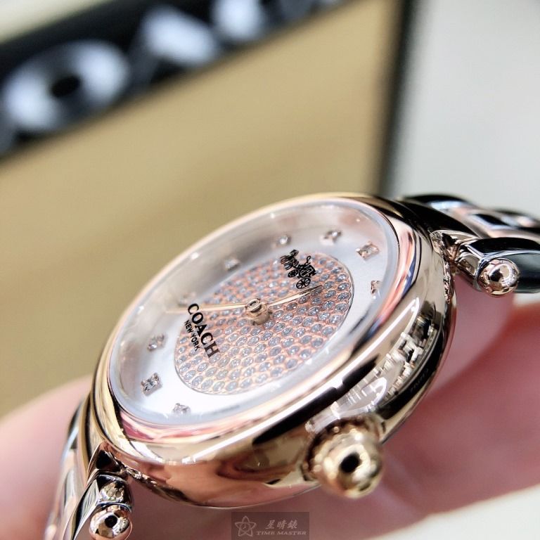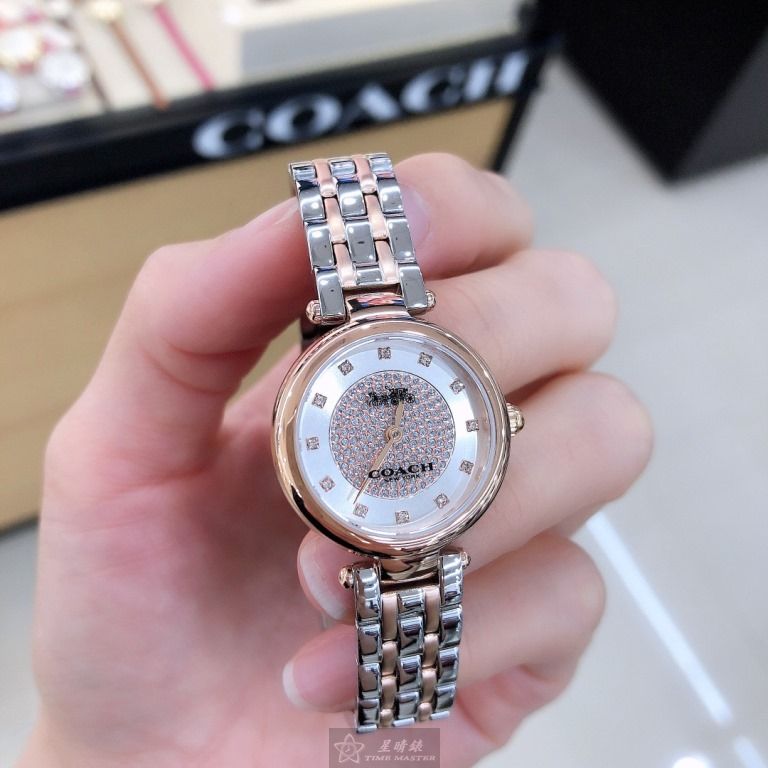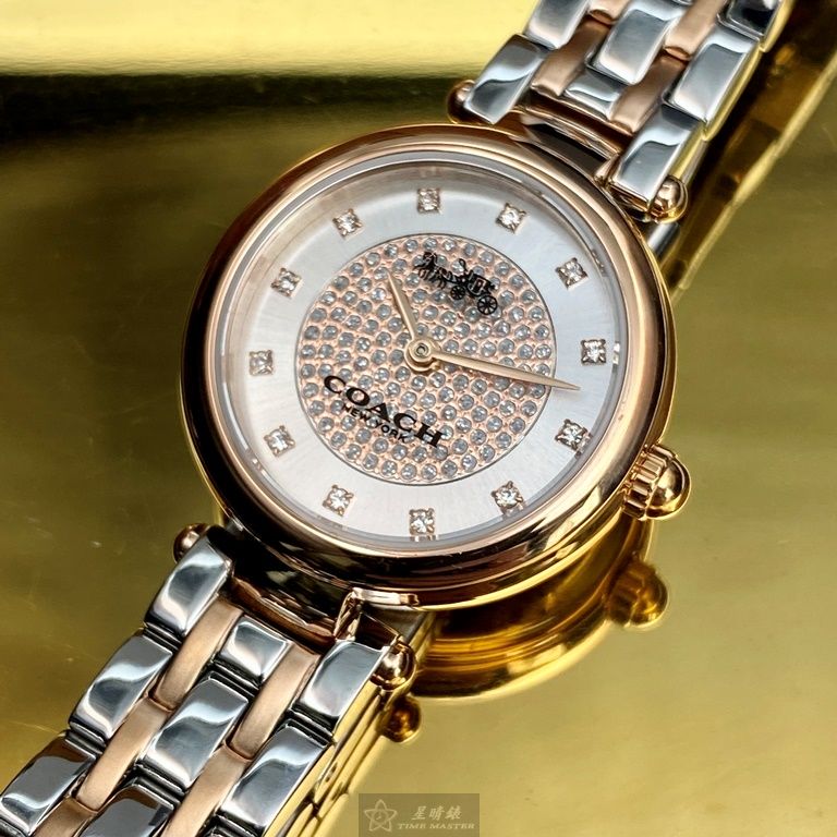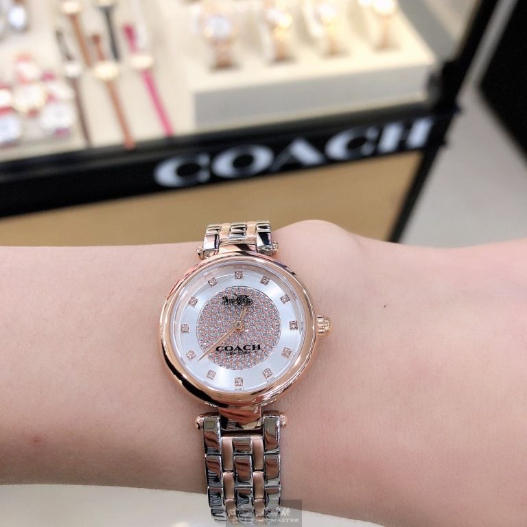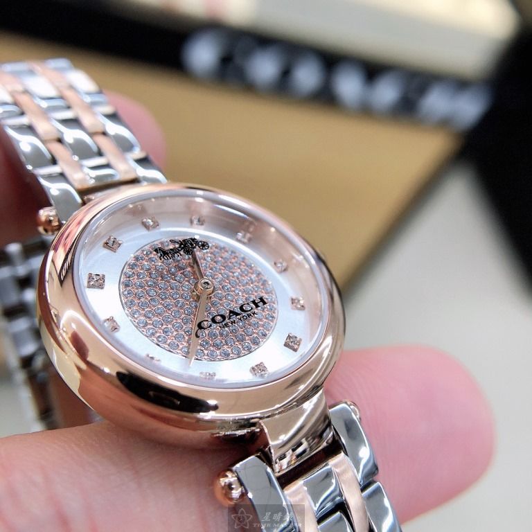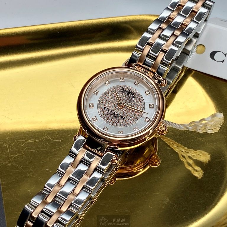 COACH手錶,編號CH00078,26mm玫瑰金圓形精鋼錶殼,銀色滿天星錶面,金銀相間精鋼錶帶款,閃亮度冠絕全場!