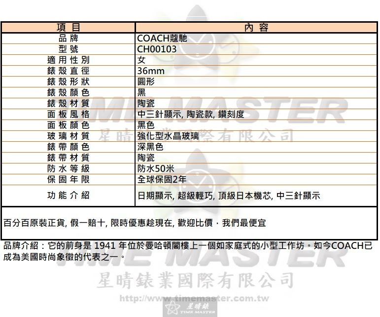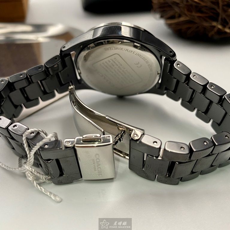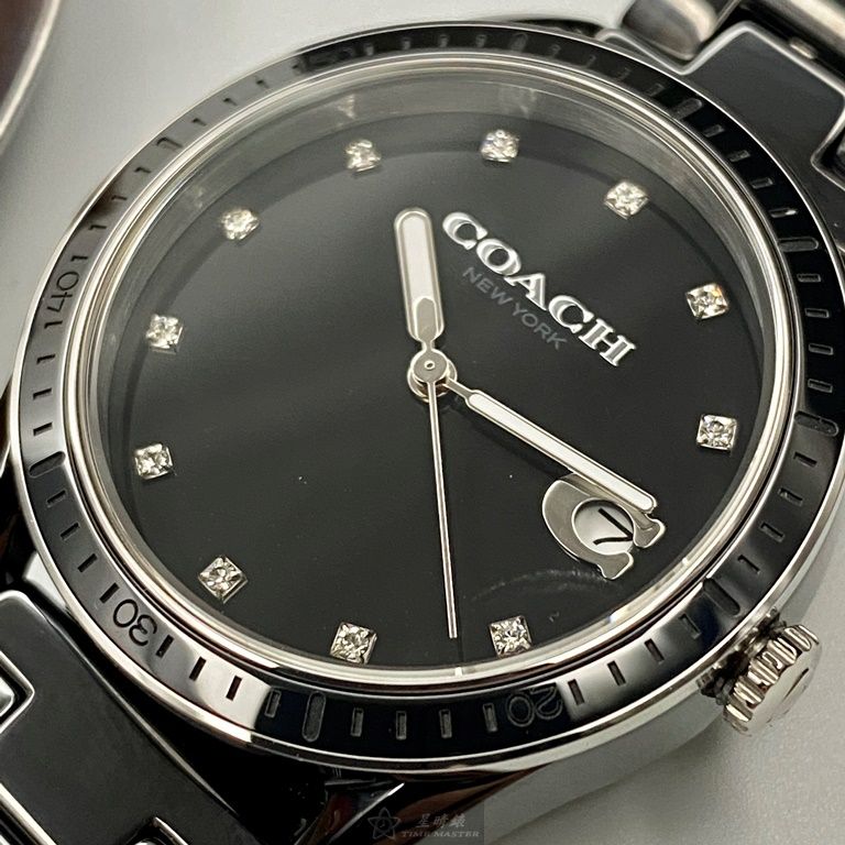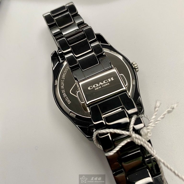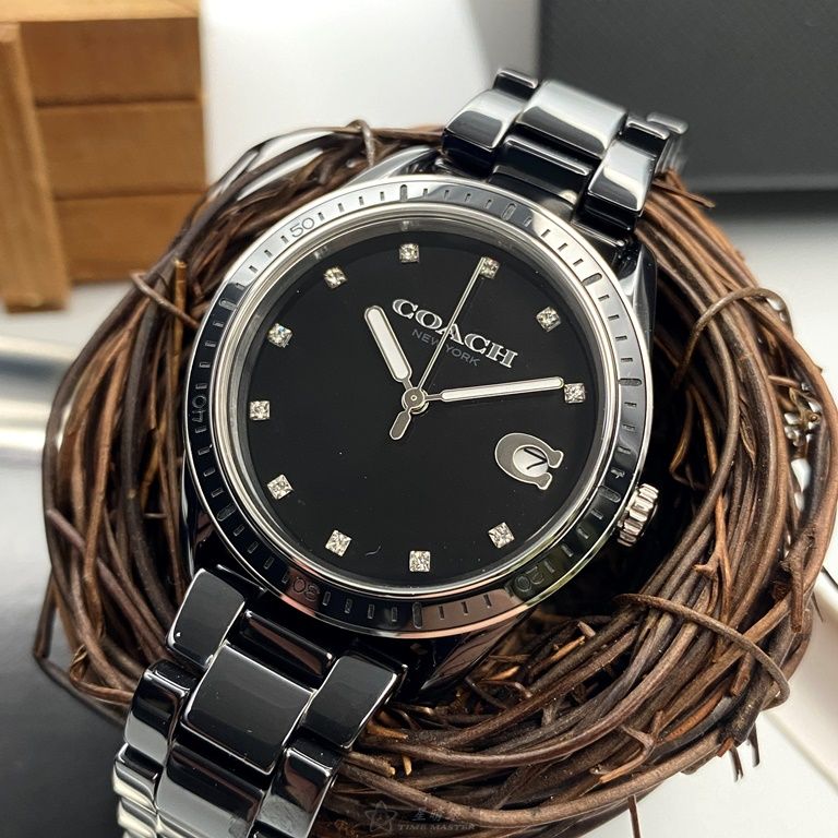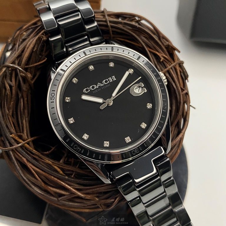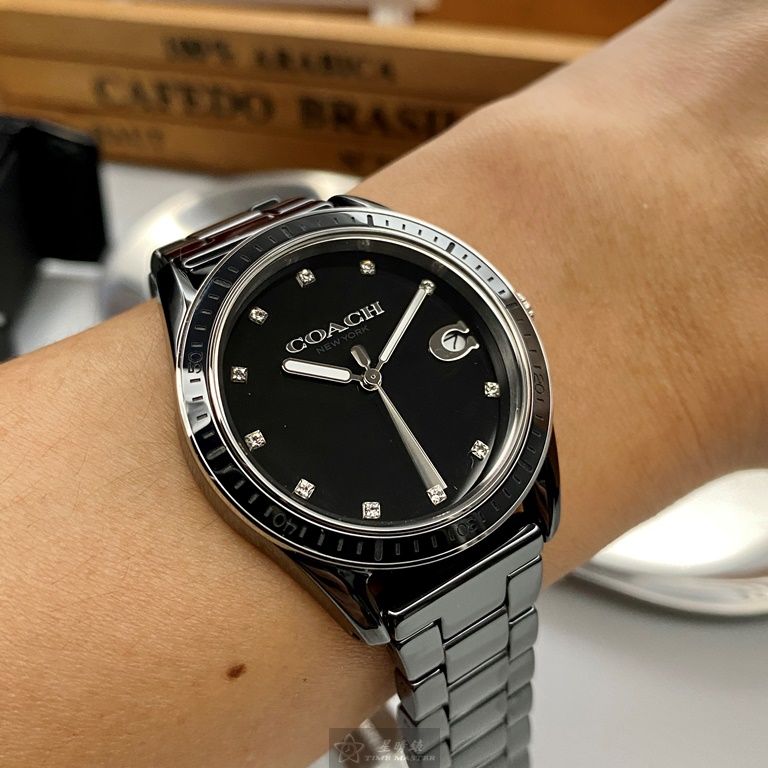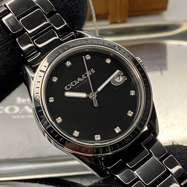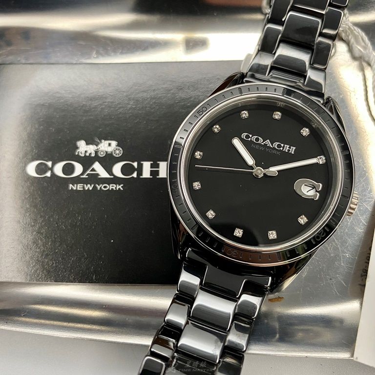 COACH手錶,編號CH00103,36mm黑圓形陶瓷錶殼,黑色中三針顯示, 陶瓷款, 鑽刻度錶面,深黑色陶瓷錶帶款