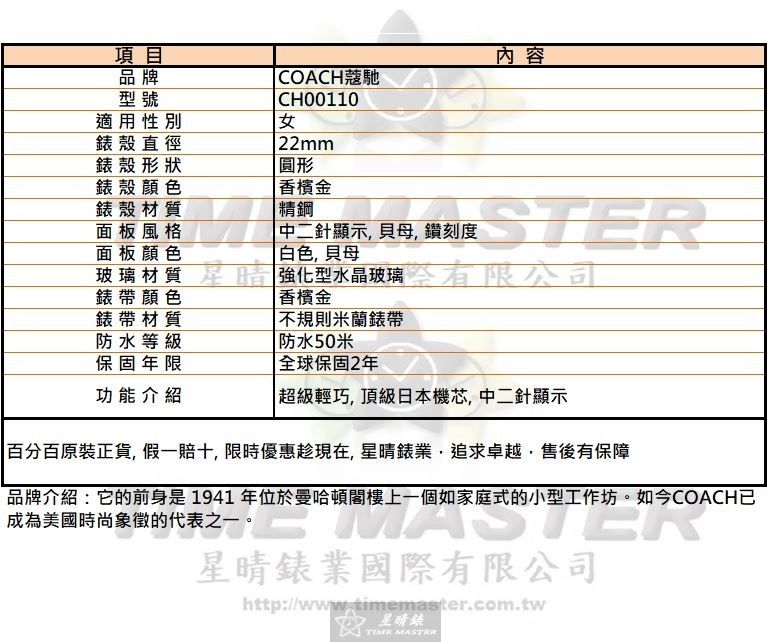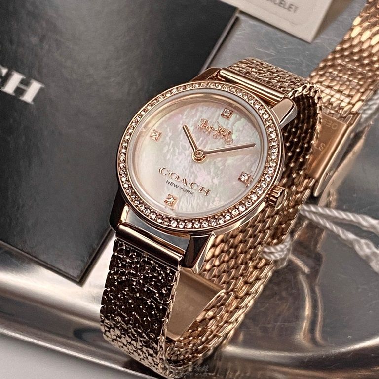 COACH手錶,編號CH00110,22mm香檳金錶殼,香檳金錶帶款