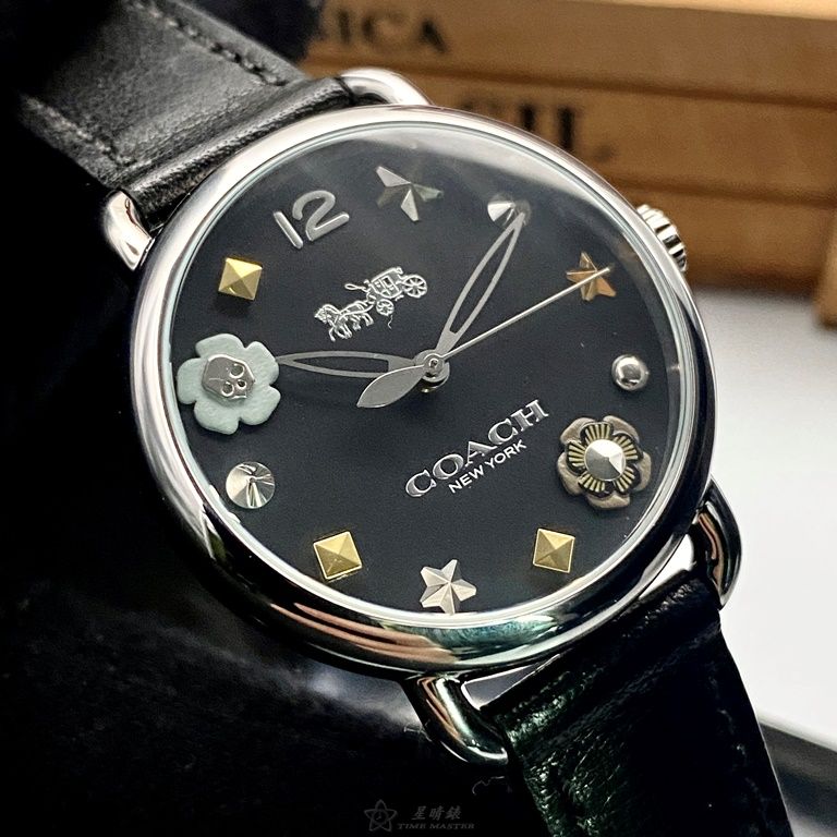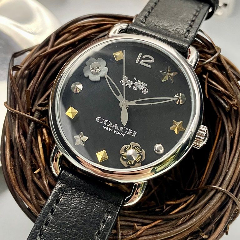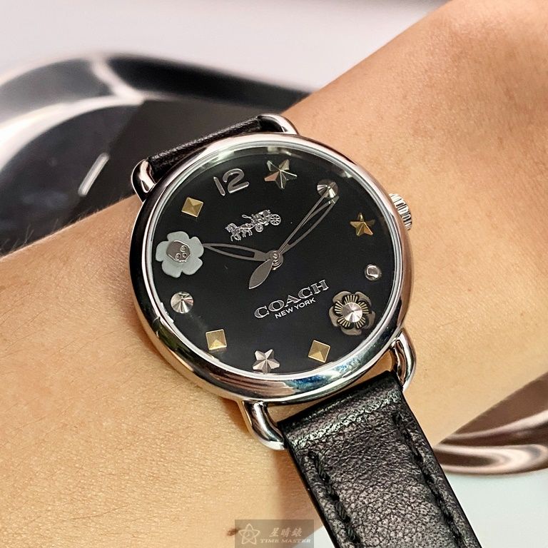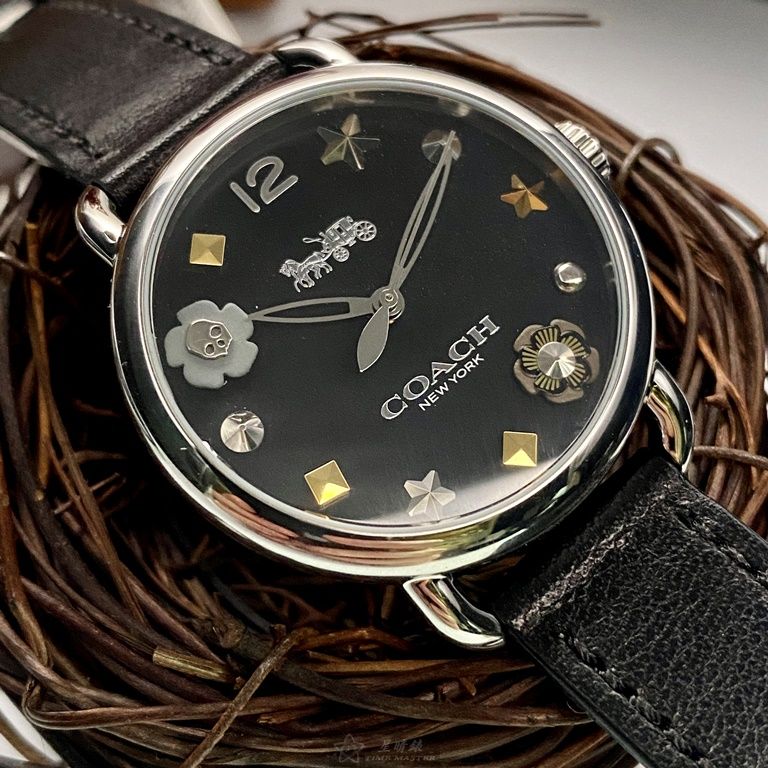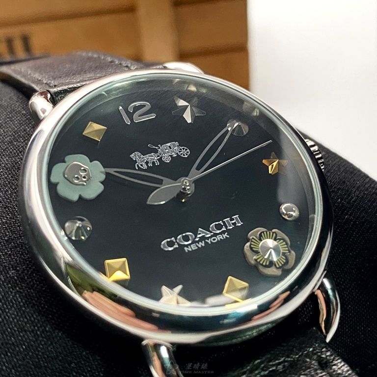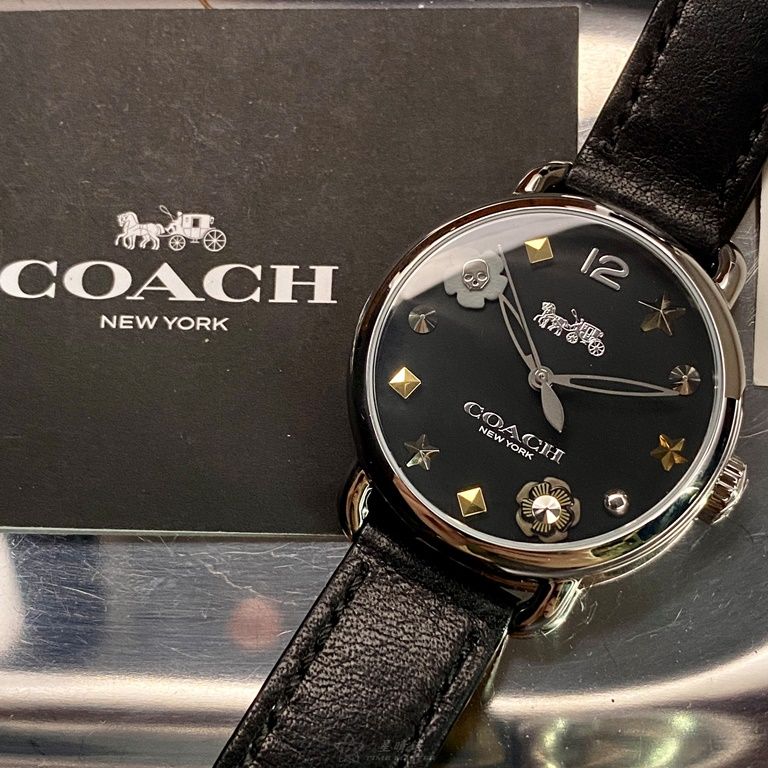 COACH手錶,編號CH00115,36mm銀圓形精鋼錶殼,黑色簡約, 中三針顯示, 繽紛錶面,深黑色真皮皮革錶帶款