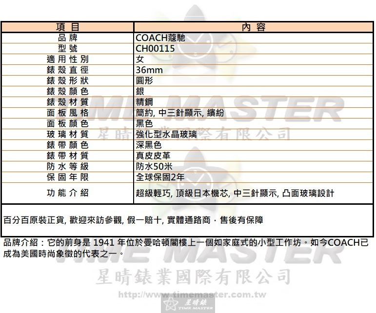 COACH蔻馳 CH00115 女錶 36mm 由星晴錶業精心打造,圓形精鋼錶殼搭配黑色真皮錶帶,雖不是最便宜的選擇,但品質穩定耐用,適合日常與辦公使用。 精緻的36mm圓形錶殼設計,搭配簡約中三針面板,黑色錶盤點綴繽紛細節,呈現低調卻不失個性的氣質,功能實用,讀時清晰明確。 強化型水晶玻璃耐磨防刮,即便日常佩戴頻繁,也能維持清晰視感,雖然價格略高,但使用感受與耐用度讓人放心。 深黑色真皮錶帶柔軟貼合手腕,佩戴舒適,長時間配戴不易變形或不適,星晴錶業堅持細膩工藝,讓每位女性都能體驗品質保證。 搭載頂級日本石英機芯,中三針精準走時,超級輕巧的設計讓手腕輕鬆無負擔,雖然不是頂級奢華款,但功能與實用兼具。 錶殼銀色精鋼材質,簡單而耐看的外觀,適合各種服裝搭配,星晴錶業承諾品質可靠,價格雖非最低,但保值與耐用兼顧。 50米防水等級設計,日常洗手、下雨天佩戴都無需擔心,凸面玻璃設計增加層次感,實用與美觀兼顧,細節用心呈現。 全球保固2年,讓購買更安心,售後服務完整,星晴錶業將每一次售出視為肩負使命,用心照顧每位顧客的使用體驗。 中三針顯示與繽紛面板設計,簡單操作即可掌握時間,雖然沒有過多華麗裝飾,但耐看實用,適合追求低調質感的女性。 整體設計輕巧便利,精鋼錶殼與真皮錶帶平衡耐用與舒適,價格合理而不廉價,是一款可以放心日常佩戴、長期使用的女錶。