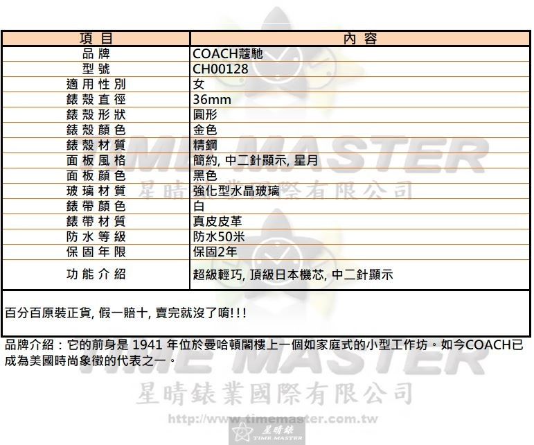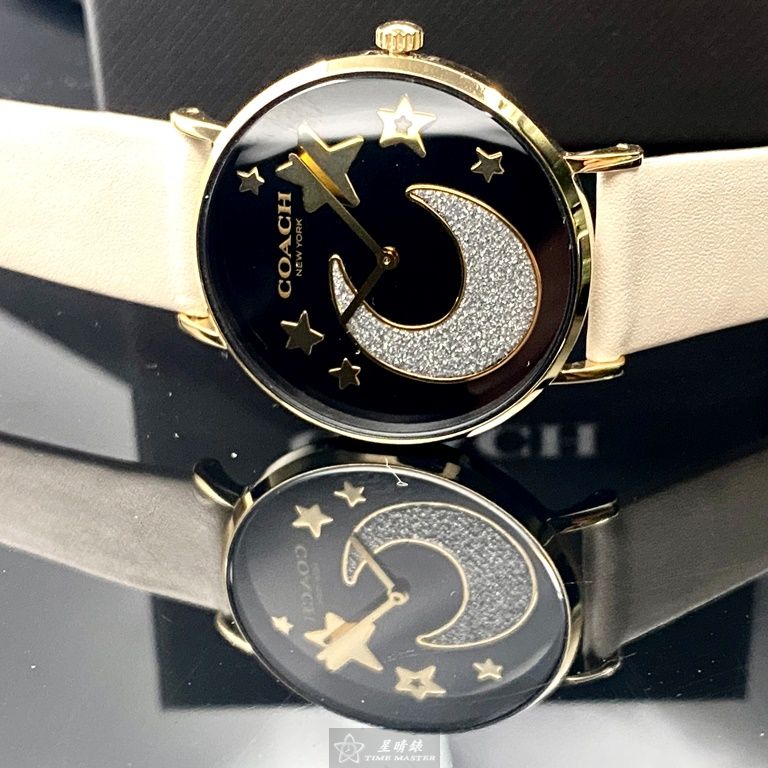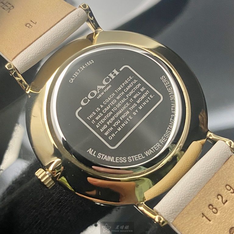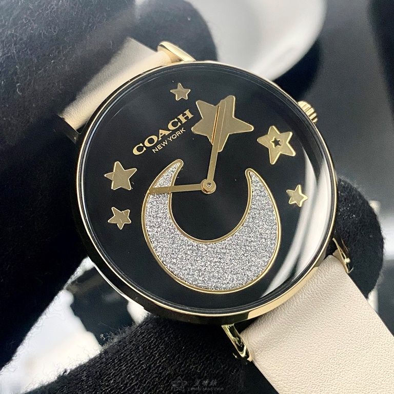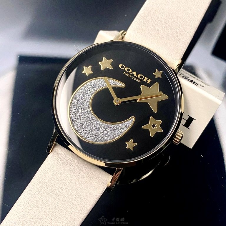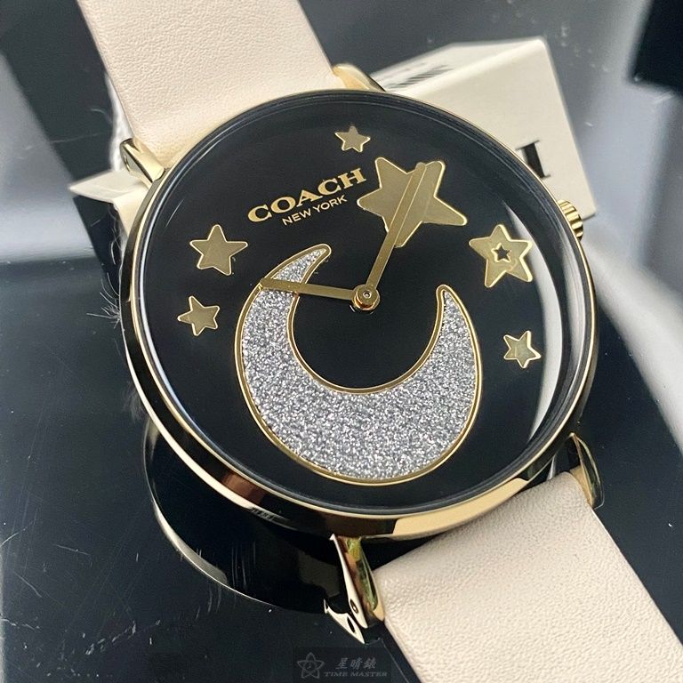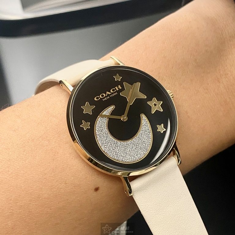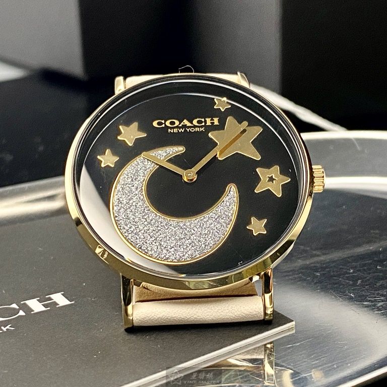 COACH手錶,編號CH00128,36mm金色圓形精鋼錶殼,黑色簡約, 中二針顯示, 星月錶面,白真皮皮革錶帶款