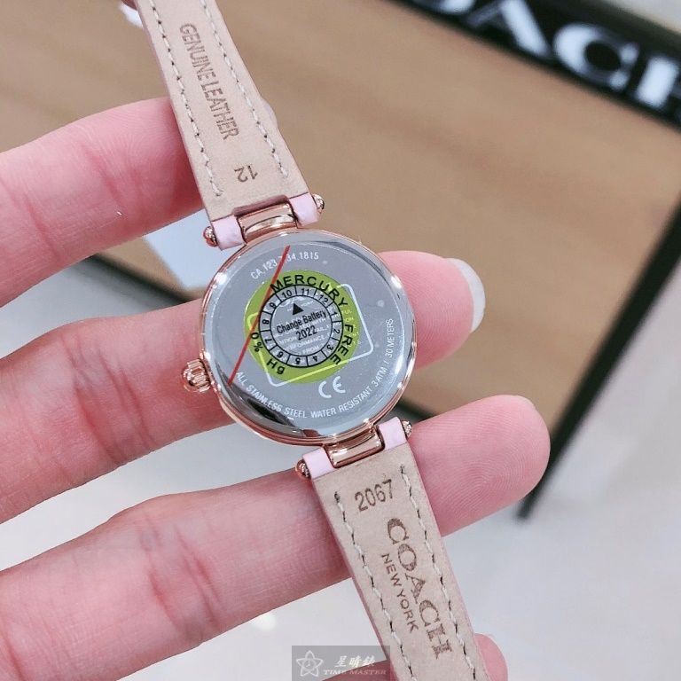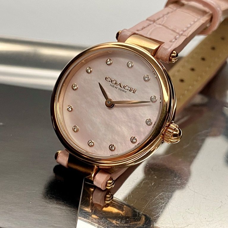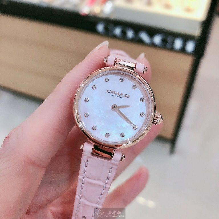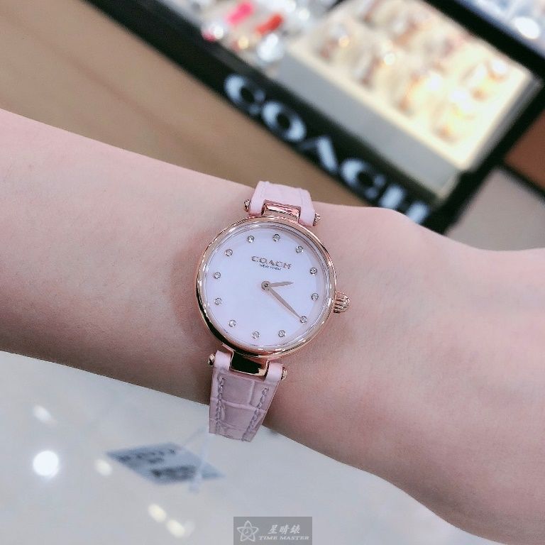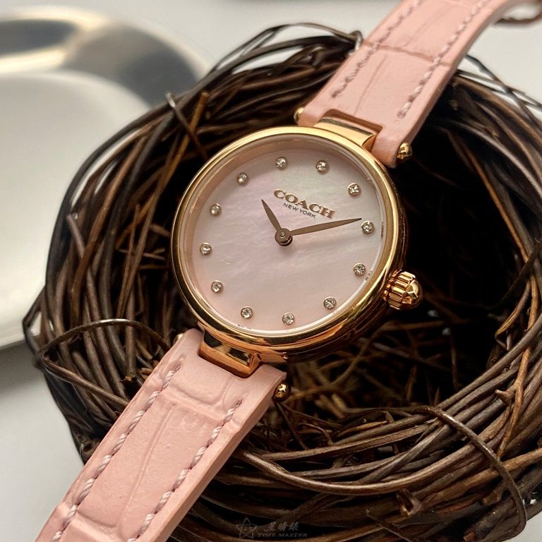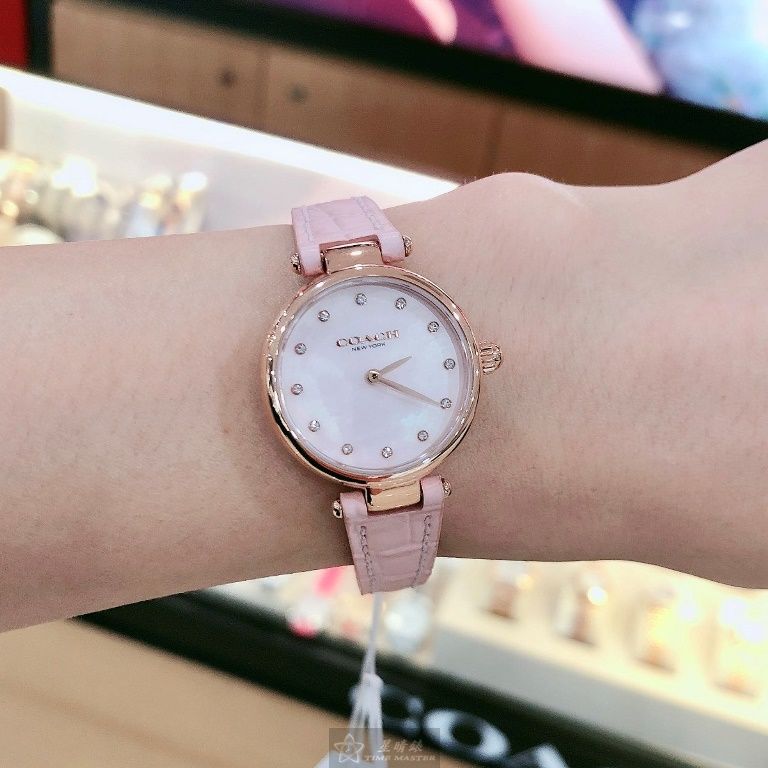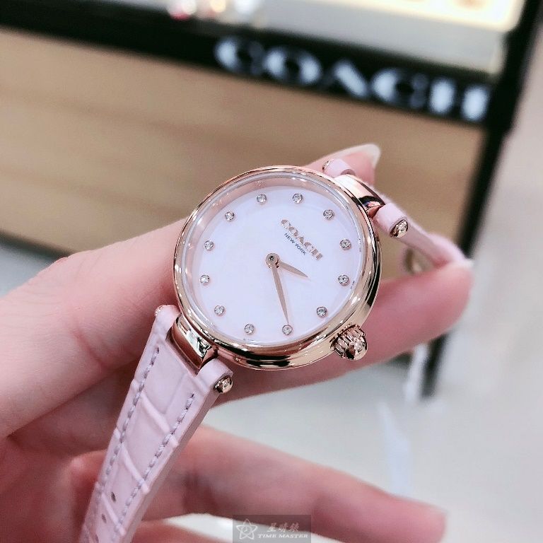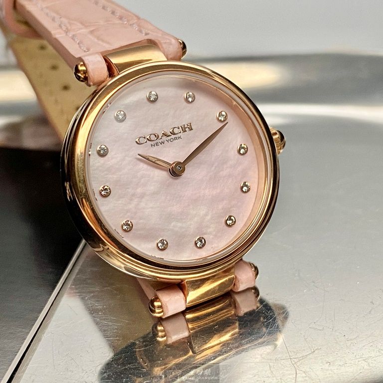 COACH手錶,編號CH00146,26mm玫瑰金圓形精鋼錶殼,粉紅色簡約, 中二針顯示, 鑽圈錶面,粉紅真皮皮革錶帶款