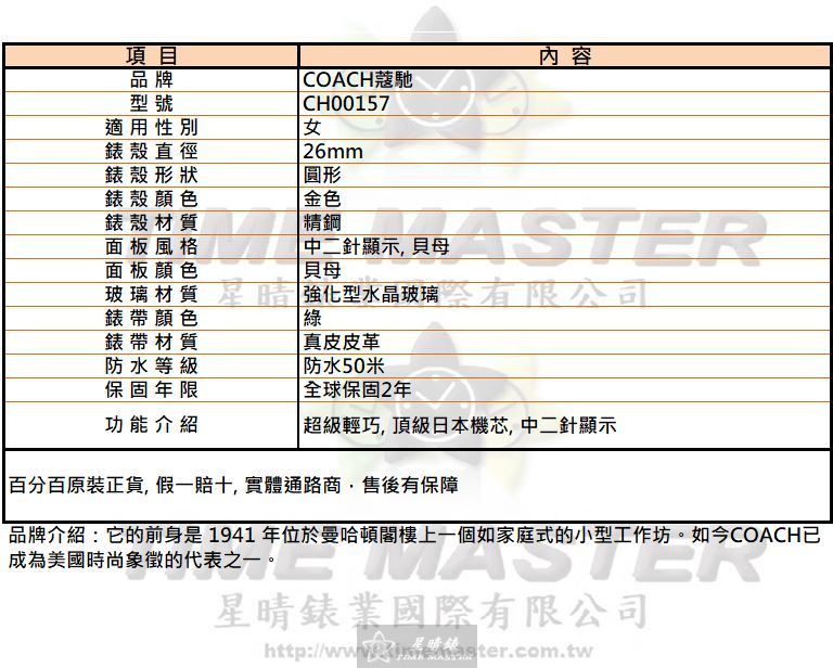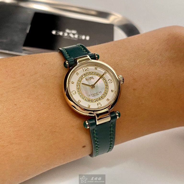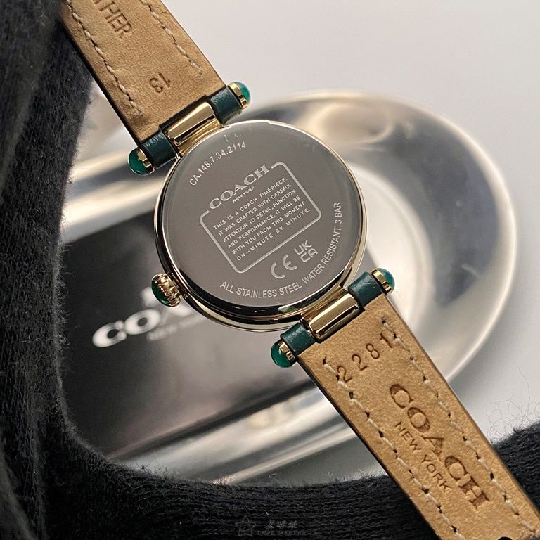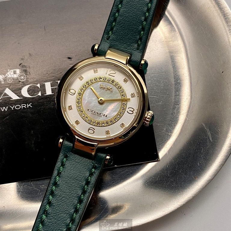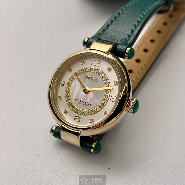 COACH手錶,編號CH00157,26mm金色圓形精鋼錶殼,貝母中二針顯示, 貝母錶面,綠真皮皮革錶帶款