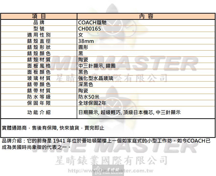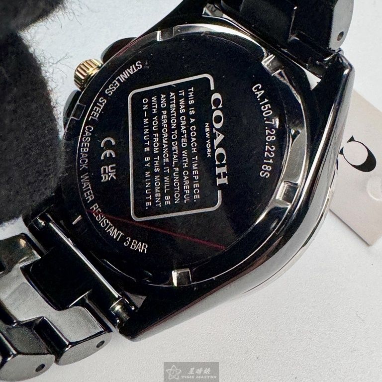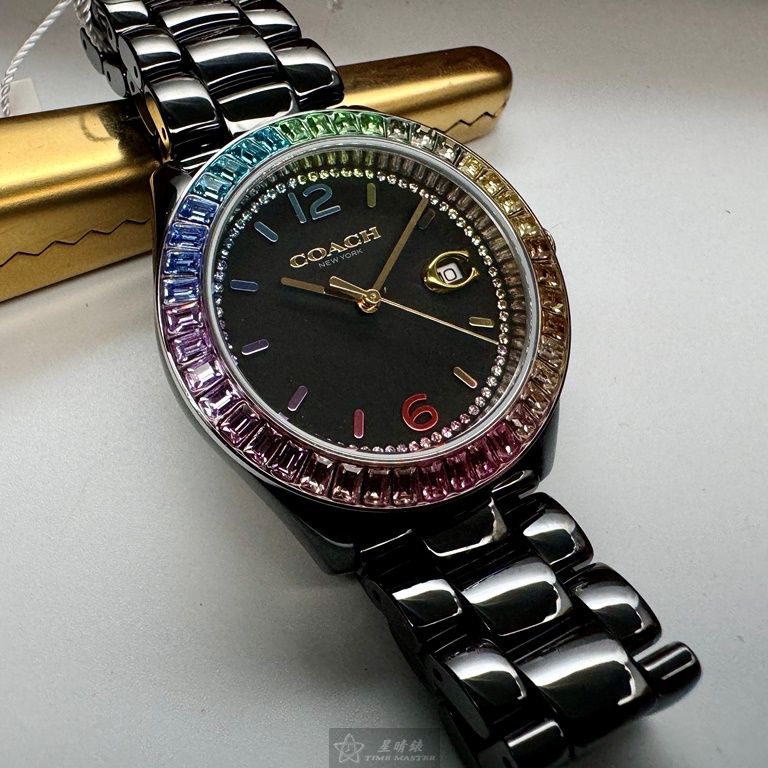COACH手錶,編號CH00165,38mm黑圓形陶瓷錶殼,黑色中三針顯示, 鑽圈錶面,深黑色陶瓷錶帶款