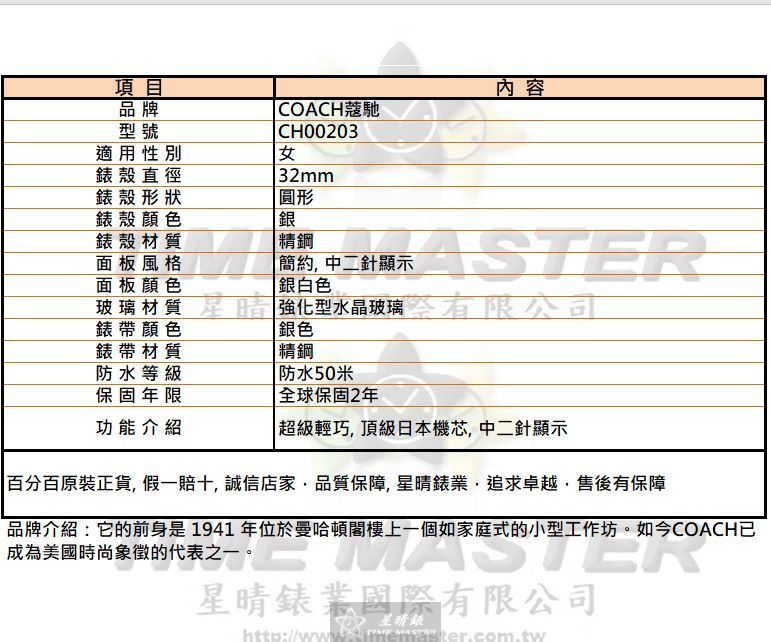 星晴錶業帶來COACH蔻馳女錶 CH00203,精鋼打造,32mm圓形錶殼,銀色簡約設計,彰顯女性優雅氣質。配備石英機芯,可靠精準,讓您時刻把握每分每秒。 面板採用銀白色設計,簡約中二針顯示,清晰易讀。強化型水晶玻璃,耐磨耐用,保護錶面不受刮傷。錶帶同樣精鋼打造,銀色搭配錶殼,完美呼應,展現整體一致美感。 此錶防水50米,輕鬆應對日常生活中的水漬。全球保固2年,讓您購買無後顧之憂。COACH蔻馳女錶CH00203,超級輕巧,頂級日本機芯,為您帶來精準時刻,散發自信魅力。
