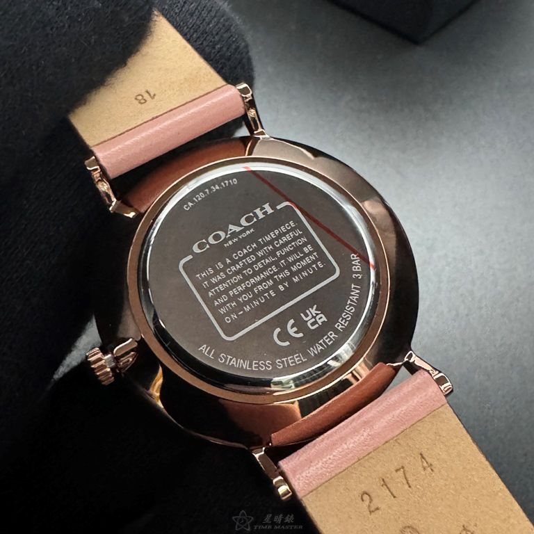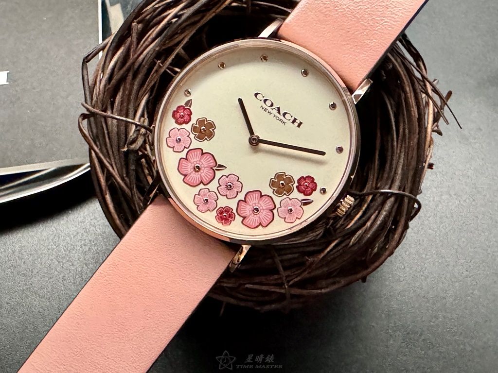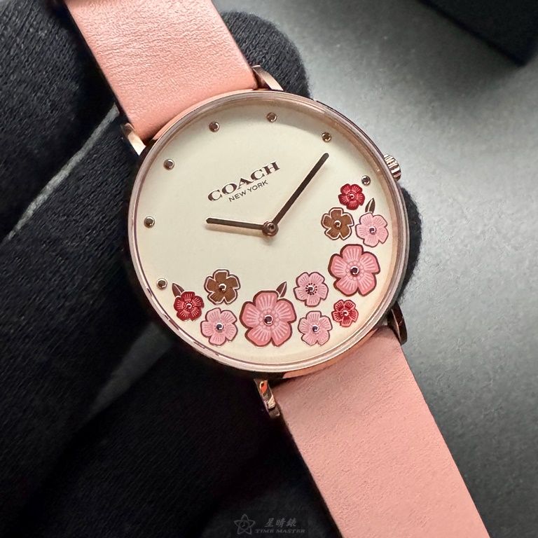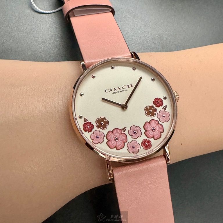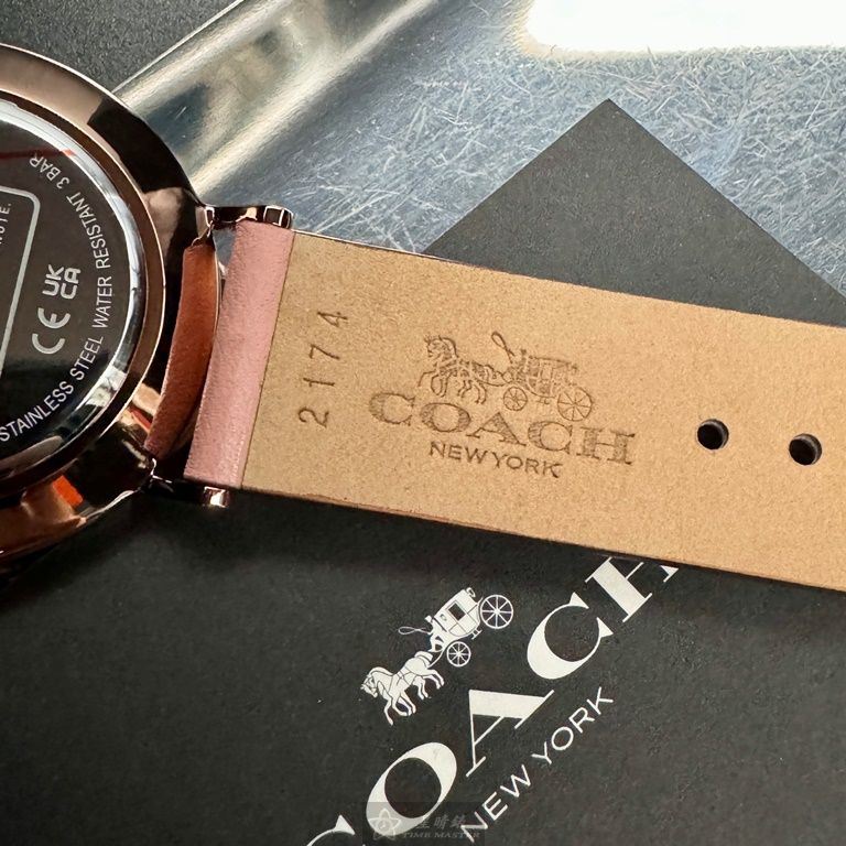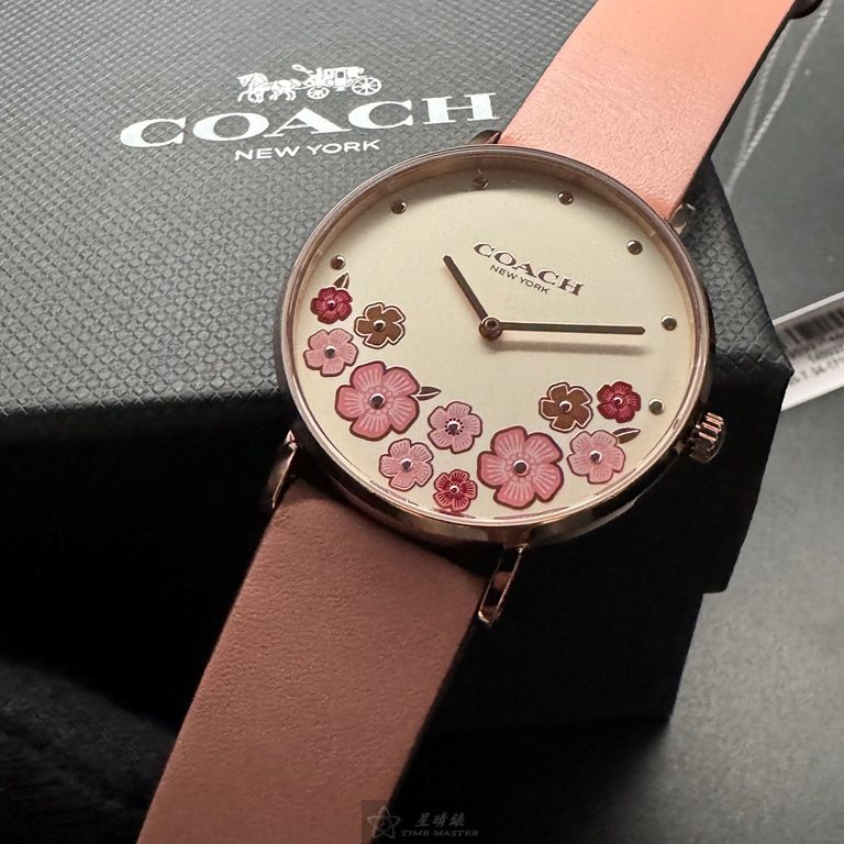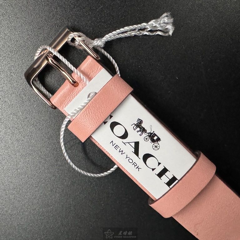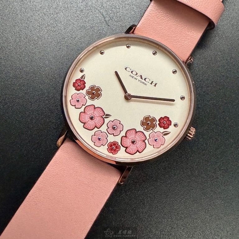 COACH手錶,編號CH00204,36mm玫瑰金圓形精鋼錶殼,白色中二針顯示, 山茶花錶面,粉紅真皮皮革錶帶款