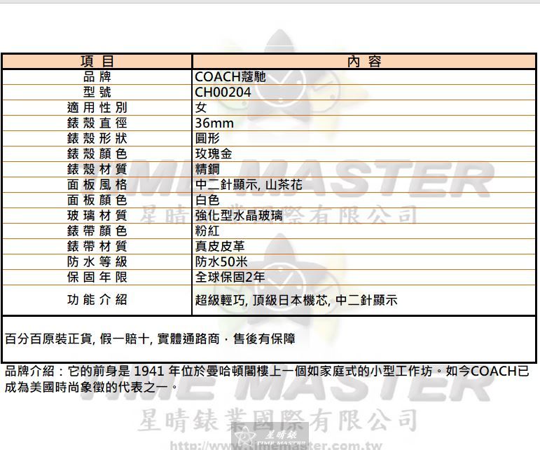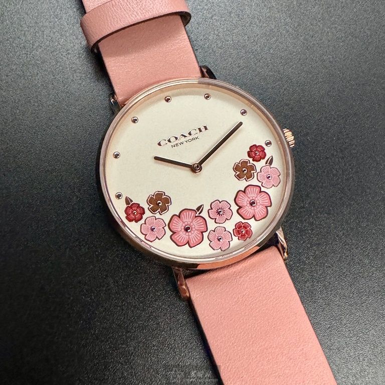 COACH蔻馳 CH00204 36mm 以星晴錶業的細膩選品為起點,讓這款女錶以務實而安靜的方式陪伴每一天。 這款石英機芯女錶或許不是市面上最耀眼的選擇,但它以穩定度與輕巧度展現出難以取代的實用價值。 玫瑰金精鋼圓形錶殼與白色山茶花面盤的搭配,雖不誇張奪目,卻能在低調中展現柔美質感。 中二針顯示的面板配置簡潔明瞭,讓閱讀時間成為一件舒服、不費力的事。 強化型水晶玻璃的耐用性帶來踏實的安全感,使日常碰撞不再是需要擔心的負擔。 粉紅真皮皮革錶帶佩戴起來服貼舒適,以務實細節呈現出溫柔卻可靠的陪伴。 50米防水設計雖不算極端性能,但足以滿足日常生活的多數情境,讓佩戴更放心。 內載頂級日本機芯,以穩定、輕巧與耐用構成它默默完成使命的核心能力。 全球保固2年的配置不張揚,但確實提供了使用者長期安心的支持。 它不是要征服目光的商品,而是一款以品質、耐用與務實魅力,肩負起陪伴你每一天的輕巧使命感的女錶。
