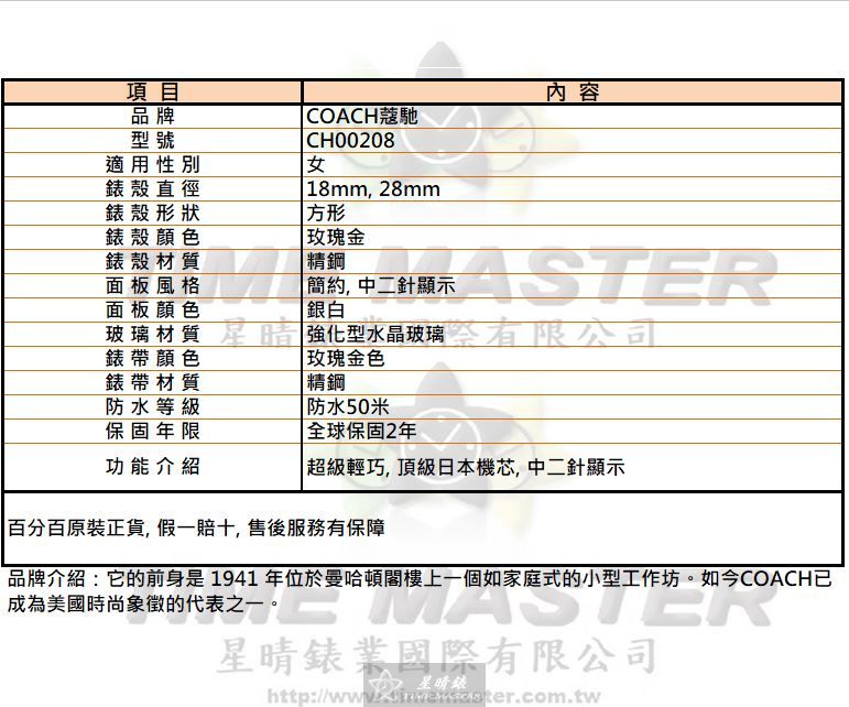 COACH蔻馳 CH00208 女錶 18mm/28mm 錶殼直徑採用精鋼玫瑰金材質,簡約銀白面板搭配中二針顯示,為日常佩戴帶來細膩輕巧感受。 這款 CH00208 石英女錶雖然價格不算最便宜,但每個細節都經過精心打磨,玫瑰金色精鋼錶帶呈現低調優雅。 COACH CH00208 方形錶殼設計,搭配強化型水晶玻璃,耐用性與美觀兼具,讓你在日常使用中無需擔心刮傷。 精準的頂級日本機芯確保時間穩定可靠,即使價格親民,也不妥協在走時品質上。 玫瑰金色錶帶和簡約面板相互呼應,18mm 和 28mm 兩種錶徑選擇,滿足不同場合與手腕尺寸需求。 防水50米設計讓 CH00208 女錶在生活防水場景中依然安心佩戴,無需頻繁拆卸。 手錶重量輕巧,戴上手幾乎沒有負擔,彰顯星晴錶業對女性佩戴舒適度的細心考量。 全球保固2年,售後有保障,價格雖不最低,但品質與安心感是我們肩負的承諾。 COACH CH00208 女錶中二針簡約顯示,符合現代女性對實用與美感兼具的需求,細節處見真章。 這款 CH00208 石英女錶兼具優雅外觀與耐用功能,是對自己或送禮時可靠的選擇,品質精良值得信賴。