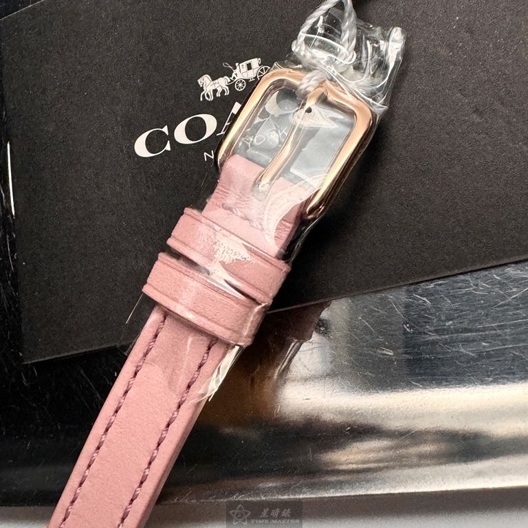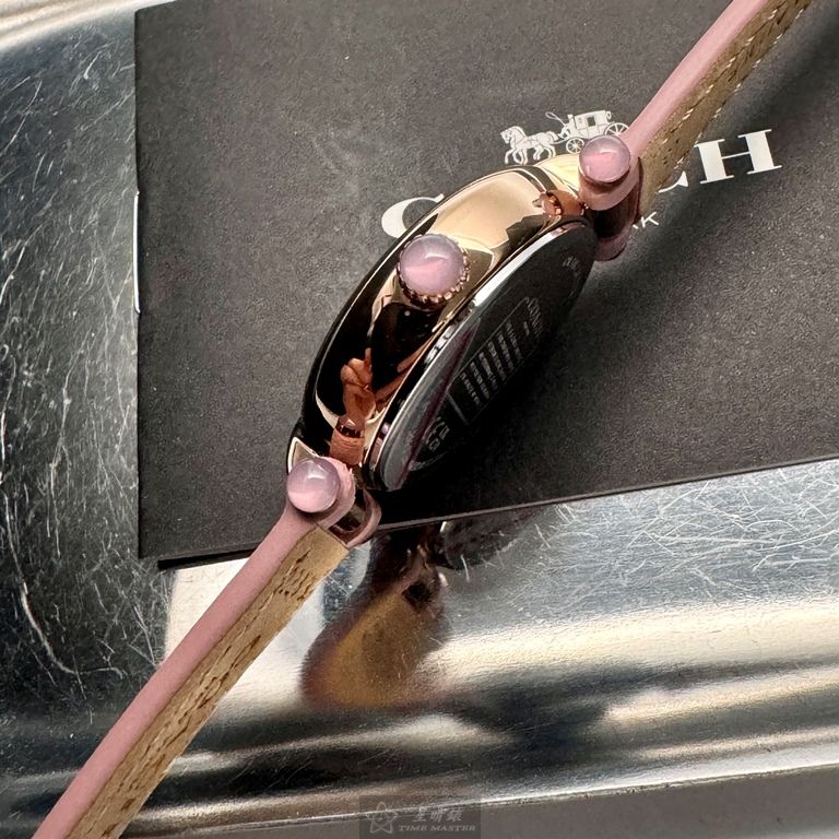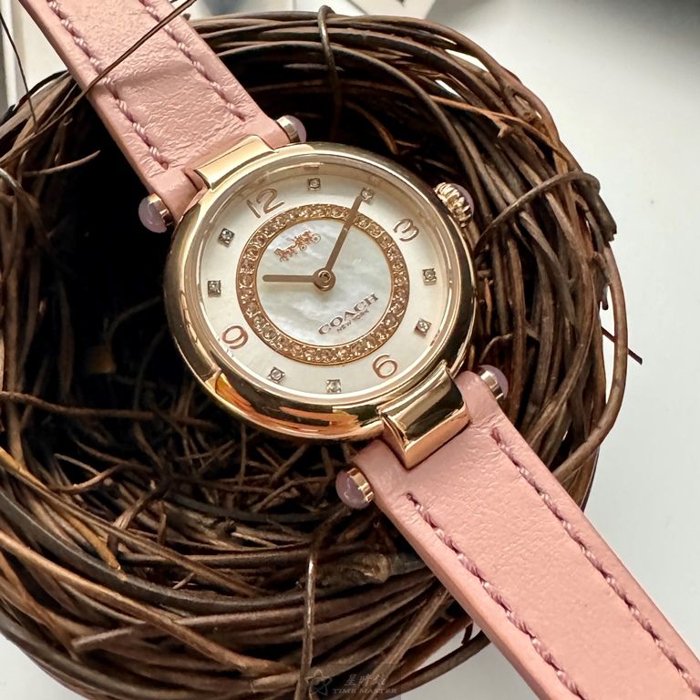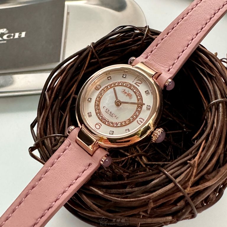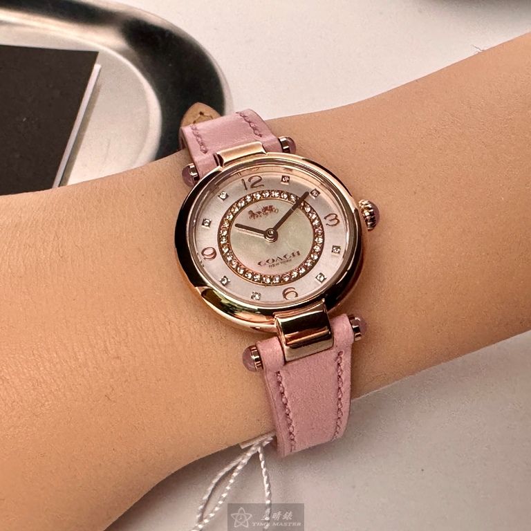 COACH手錶,編號CH00211,26mm玫瑰金圓形精鋼錶殼,貝母中二針顯示, 鑽圈錶面,粉紅真皮皮革錶帶款
