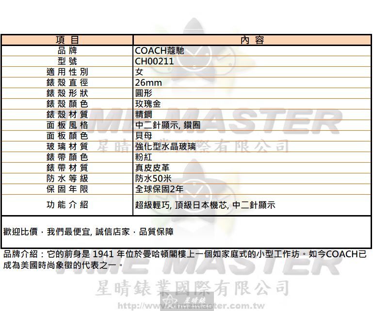 COACH蔻馳 CH00211 女錶,錶殼直徑26mm,玫瑰金精鋼材質,搭配粉紅真皮錶帶,整體輕巧適合日常佩戴,雖不是最便宜,但品質細膩,耐用可靠。 COACH蔻馳 CH00211 女錶採用頂級日本石英機芯,中二針顯示設計,走時穩定,精準可靠,帶來低調實用的佩戴體驗。 COACH蔻馳 CH00211 女錶的貝母面板搭配鑽圈點綴,細節展現精緻工藝,雖然價格略高,但每一處都經過精心打磨。 COACH蔻馳 CH00211 女錶搭配強化型水晶玻璃鏡面,有效防刮耐用,讓日常使用更安心,承諾每一個細節都是精良品質。 COACH蔻馳 CH00211 女錶防水50米,日常生活中洗手、遇小雨均無顧慮,功能實用,表現出品牌對品質的責任感。 COACH蔻馳 CH00211 女錶粉紅真皮錶帶柔軟舒適,貼合手腕,雖然不是最便宜的選擇,但帶來舒適感受與耐久性。 COACH蔻馳 CH00211 女錶精鋼錶殼堅固耐用,玫瑰金色澤低調優雅,適合追求細膩實用的女性,展現品牌對工藝的堅持。 COACH蔻馳 CH00211 女錶全球保固2年,售後無憂,雖價格中等,但購買後使用安心,肩負起品牌對顧客的責任。 COACH蔻馳 CH00211 女錶超輕巧設計,方便日常佩戴,不增加手腕負擔,每一次佩戴都能感受到精工細作的質感。 COACH蔻馳 CH00211 女錶細膩實用的設計理念,結合日本頂級機芯與精鋼材質,雖價格非最低,但每一分錢都換來耐用與安心。