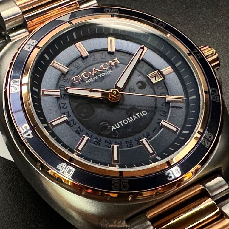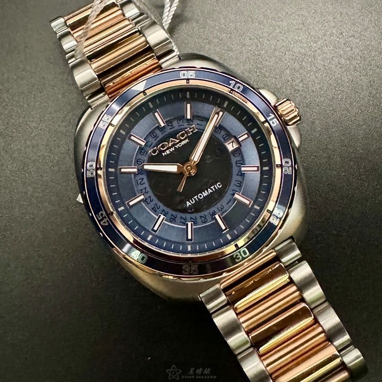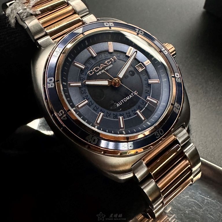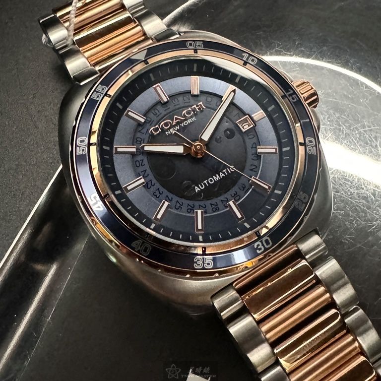 COACH手錶,編號CH00214,46mm玫瑰金圓形精鋼錶殼,寶藍色鏤空, 中三針顯示, 運動錶面,金銀相間精鋼錶帶款