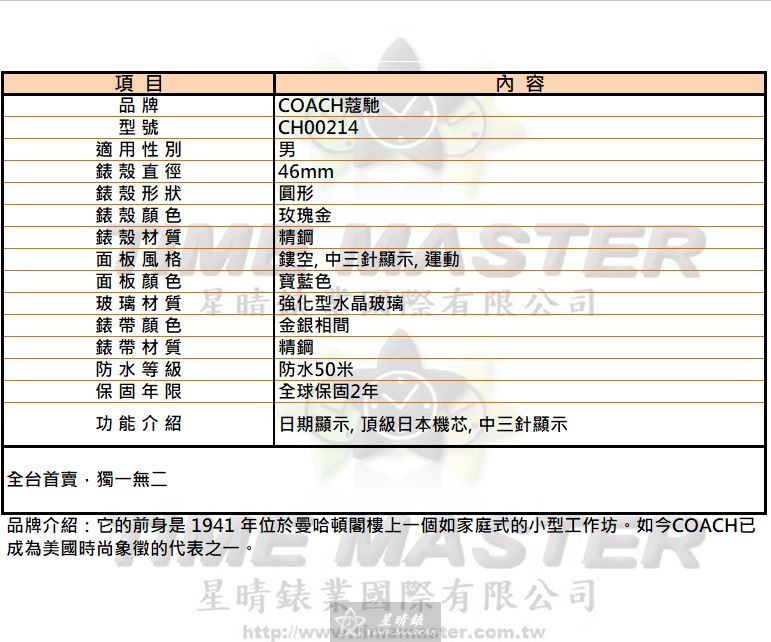 COACH蔻馳 CH00214 男錶 46mm 以玫瑰金精鋼錶殼與寶藍色鏤空面板展現細緻工藝,即便價格不是最低,仍兼具耐用與質感。 COACH蔻馳 CH00214 男錶 46mm 採用自動機械機芯與中三針顯示,功能實用,讓日常佩戴既準確又可靠。 COACH蔻馳 CH00214 男錶 46mm 錶帶金銀相間精鋼設計,不追求浮誇,注重手感與持久耐用。 COACH蔻馳 CH00214 男錶 46mm 強化型水晶玻璃保護面板,抗刮耐磨,符合日常生活需求。 COACH蔻馳 CH00214 男錶 46mm 防水50米設計,雖非專業潛水錶,卻能安心應付日常淋水與洗手。 COACH蔻馳 CH00214 男錶 46mm 配備日期顯示與頂級日本機芯,實用與精準兼備,價格合理且值得信賴。 COACH蔻馳 CH00214 男錶 46mm 圓形錶殼搭配鏤空運動風面板,外觀低調但細節精緻,散發成熟魅力。 COACH蔻馳 CH00214 男錶 46mm 全球保固2年,售後服務完整,讓購買無後顧之憂,堅持品質承諾。 COACH蔻馳 CH00214 男錶 46mm 精鋼材質與鏤空設計,雖非市場最便宜,卻帶來長久耐用的安心感。 COACH蔻馳 CH00214 男錶 46mm 適合肩負日常挑戰的男士佩戴,兼顧實用、質感與可靠性,每一次配戴都是責任與品味的展現。