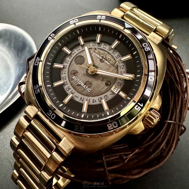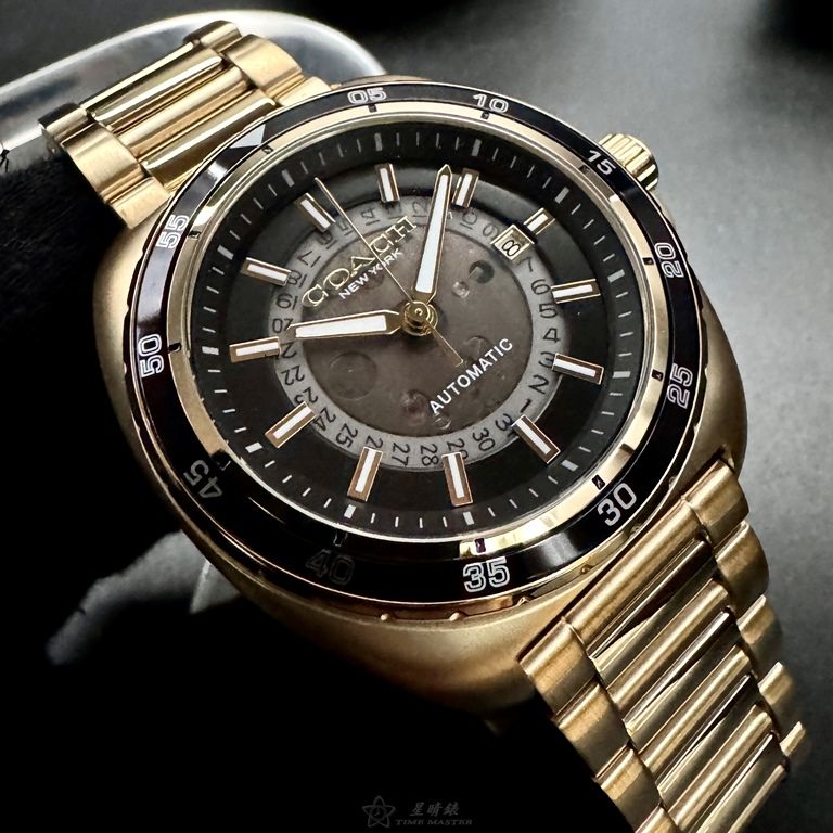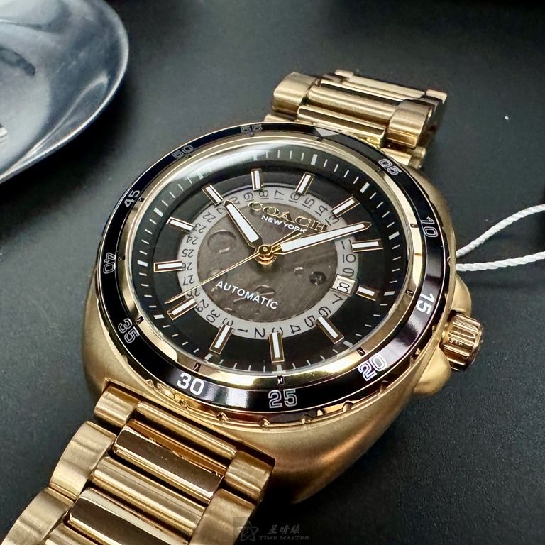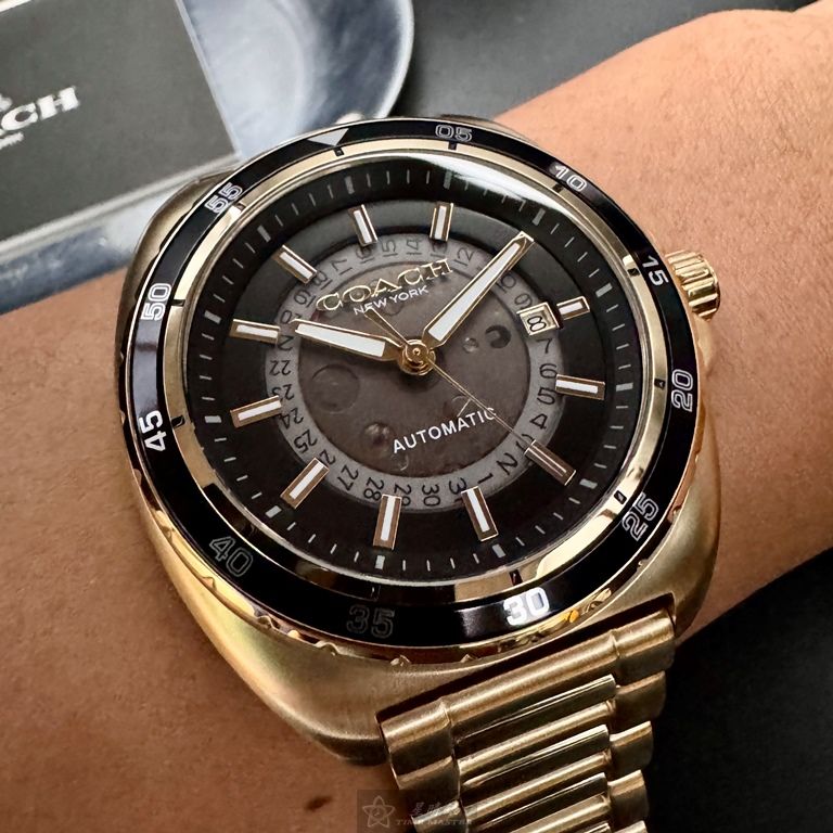 COACH手錶,編號CH00217,46mm金色圓形精鋼錶殼,雙面機械鏤空中三針顯示, 運動錶面,金色精鋼錶帶款