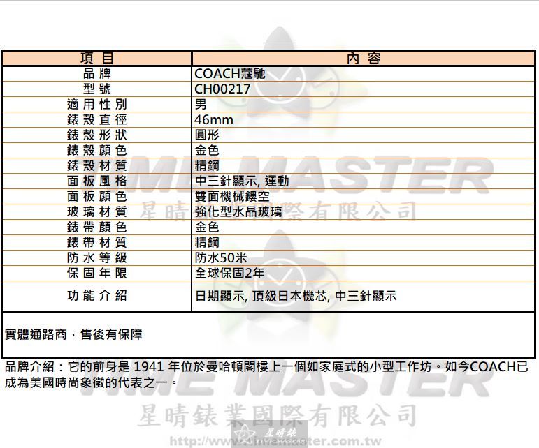 COACH蔻馳 CH00217 46mm 男錶以精鋼金色錶殼打造,搭配雙面鏤空機械面板,展現穩重又不失細節感的運動風格。 精鋼金色錶帶與強化型水晶玻璃相輔相成,雖然價格不算最便宜,但每一處加工都確保耐用與質感。 自動機械機芯搭配頂級日本機芯,提供可靠的時間精準度,讓每日佩戴都有安心感。 中三針顯示與日期功能設計,實用性高,日常使用與正式場合都能兼顧。 防水50米設計,雖不適合深潛,但日常生活防潑水、防汗水皆足夠應對。 精鋼圓形錶殼經細膩拋光處理,呈現金色光澤,質感遠超過價格本身的直覺感受。 每只COACH蔻馳 CH00217皆享有全球保固2年,讓消費者在購買時多了一份安心。 錶帶與錶殼一致的金色調,展現低調卻堅實的設計理念,佩戴舒適且穩定。 雖然不是市場上最便宜的選擇,但精良的製作與細膩的功能配置,讓價值明顯可感。 星晴錶業承諾每一只手錶都肩負品質的使命,讓佩戴者感受到手錶的誠意與耐用。