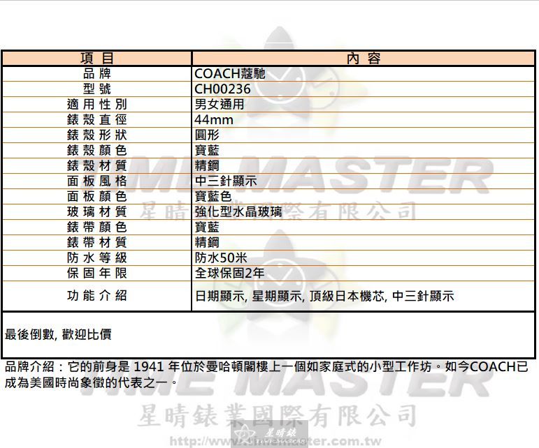COACH蔻馳 CH00236 44mm男女通用錶,寶藍色精鋼錶殼搭配中三針顯示,石英機芯運作穩定,價格雖非市場最便宜,但品質經得起日常考驗。 COACH蔻馳 CH00236 44mm男女通用錶,搭配寶藍色精鋼錶帶與強化型水晶玻璃,防水50米,讓你日常生活中無需過分擔心手錶受損。 COACH蔻馳 CH00236 44mm男女通用錶,具備日期與星期顯示功能,頂級日本機芯提供精準走時,雖非最豪華款,仍展現細膩工藝。 COACH蔻馳 CH00236 44mm男女通用錶,圓形錶殼設計簡潔,寶藍色面板與錶帶搭配和諧,整體質感不追求浮華,但非常耐看。 COACH蔻馳 CH00236 44mm男女通用錶,精鋼材質與中三針顯示兼具實用性與耐用度,價格合理,適合重視品質勝於價格的你。 COACH蔻馳 CH00236 44mm男女通用錶,石英機芯維護簡單可靠,全球保固2年,讓每一次佩戴都能安心無憂。 COACH蔻馳 CH00236 44mm男女通用錶,寶藍色精鋼錶帶耐磨抗刮,搭配強化型水晶玻璃,細膩中透露務實的堅固感。 COACH蔻馳 CH00236 44mm男女通用錶,防水50米,無論日常洗手或短暫接觸水都不必擔心,價格雖非最親民,但品質值得信賴。 COACH蔻馳 CH00236 44mm男女通用錶,面板與錶帶同色設計,整體視覺統一,簡單中帶著對細節的用心與責任感。 COACH蔻馳 CH00236 44mm男女通用錶,功能與設計兼顧實用與美觀,雖不是市面最便宜選擇,但每一處細節都能感受到精工品質。
