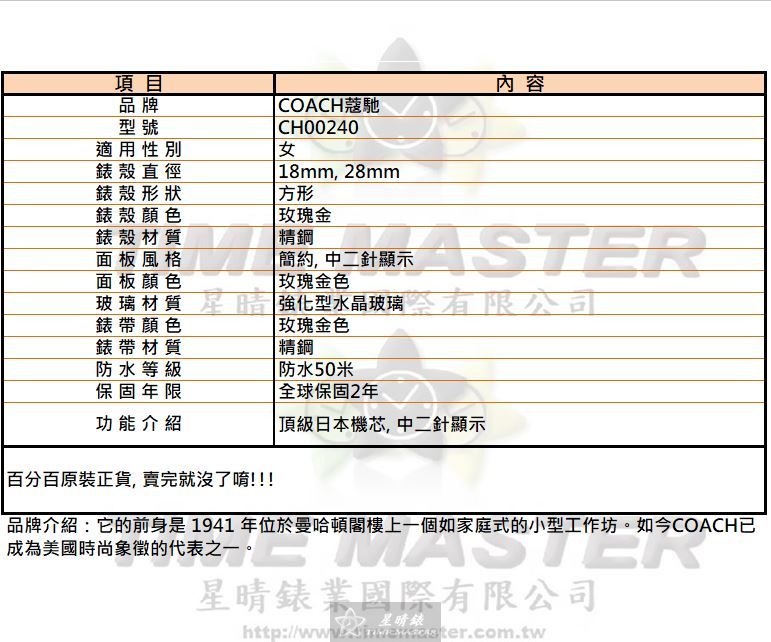 COACH蔻馳 CH00240 女錶 18mm/28mm 方形錶殼玫瑰金色,精鋼材質打造,搭載石英機芯,簡約中二針面板設計,強化型水晶玻璃保護,玫瑰金色精鋼錶帶堅固耐用,防水50米,全球保固2年,頂級日本機芯原廠限量款,讓每一次佩戴都安心。 COACH蔻馳 CH00240 女錶 18mm/28mm 專為女性設計的方形小巧錶殼,精鋼玫瑰金色澤低調優雅,搭配簡約中二針面板,實用與美感兼具,雖不是市場最便宜,但品質穩定可靠。 COACH蔻馳 CH00240 女錶 18mm/28mm 石英機芯精準走時,精鋼方形錶殼耐磨防刮,強化型水晶玻璃提升使用壽命,玫瑰金錶帶手感舒適,適合日常與正式場合佩戴,彰顯細膩品味。 COACH蔻馳 CH00240 女錶 18mm/28mm 的方形錶殼設計小巧典雅,面板玫瑰金色與錶帶呼應,防水50米讓生活中偶遇水花無需擔心,雖價格不低,但每個細節都顯示出精良工藝。 COACH蔻馳 CH00240 女錶 18mm/28mm 採用頂級日本石英機芯,中二針顯示清晰實用,精鋼錶殼與錶帶經典玫瑰金色,限量款保有獨特性,品質穩定可靠,肩負每一次準確記時的使命。 COACH蔻馳 CH00240 女錶 18mm/28mm 面板簡約,讀時便利,精鋼錶殼與錶帶搭配玫瑰金色調,既耐用又低調時尚,防水50米設計貼近日常生活需求,雖非最便宜,但值得每一分投資。 COACH蔻馳 CH00240 女錶 18mm/28mm 方形錶殼精緻小巧,精鋼材質與強化型水晶玻璃保障使用耐久度,玫瑰金色系與簡約面板設計融為一體,限量原廠款更顯珍藏價值。 COACH蔻馳 CH00240 女錶 18mm/28mm 精鋼錶帶搭配錶殼,質感細膩,防水50米讓日常佩戴更安心,簡約中二針面板清楚易讀,雖價格非最低,但工藝與可靠性讓它值得信賴。 COACH蔻馳 CH00240 女錶 18mm/28mm 擁有玫瑰金色精鋼方形錶殼與錶帶,面板中二針顯示清晰實用,日本頂級石英機芯穩定耐用,原廠限量款,呈現細膩品質與精良工藝。 COACH蔻馳 CH00240 女錶 18mm/28mm 無論日常辦公或外出社交,方形精鋼錶殼與玫瑰金色錶帶都能展現優雅品味,防水50米與全球保固2年保障使用安心,雖價格略高,卻是一款務實耐用的精品之選。