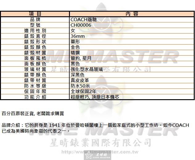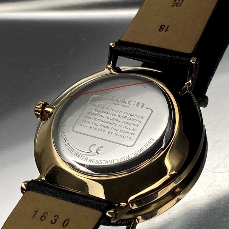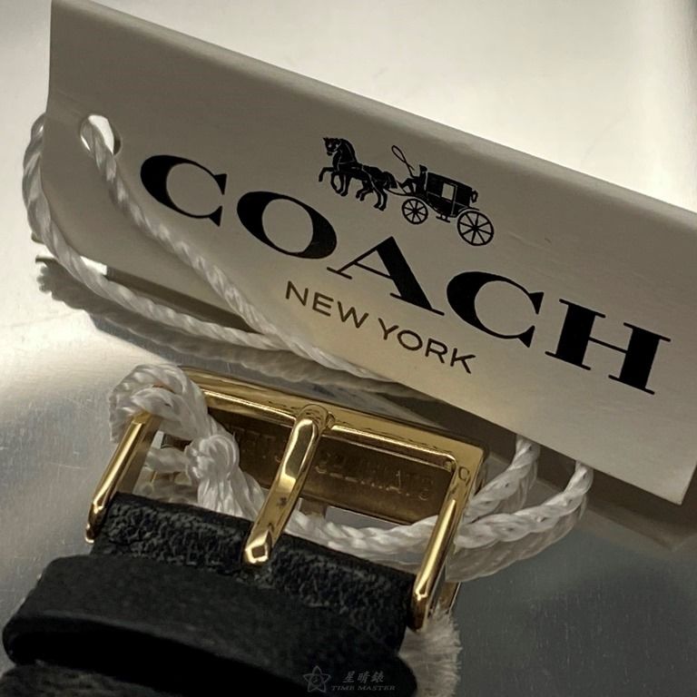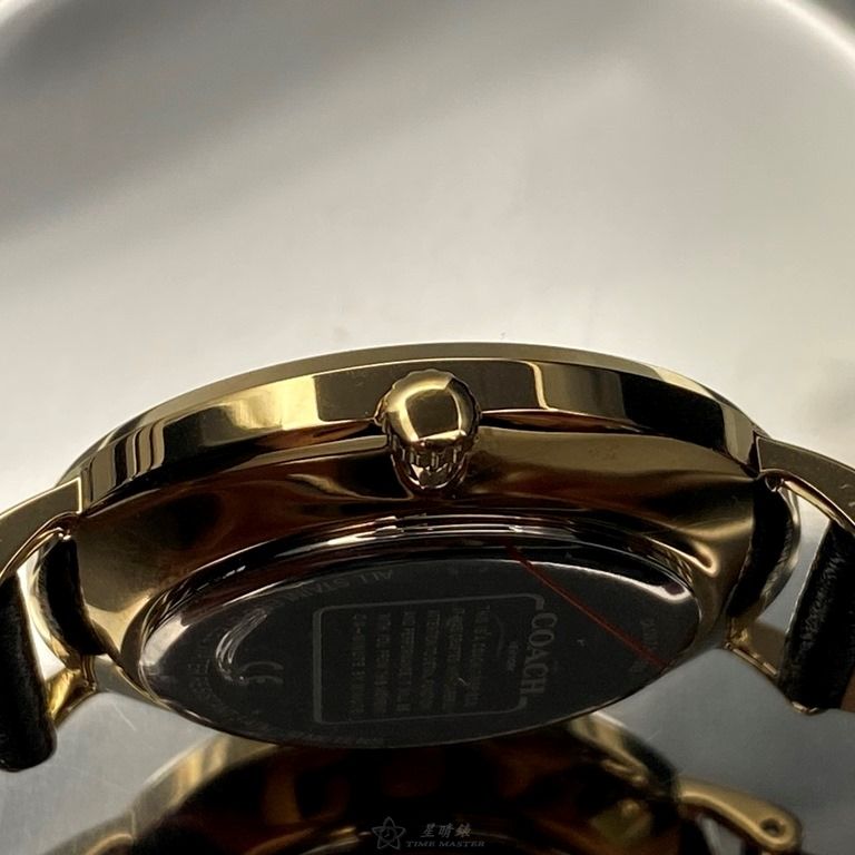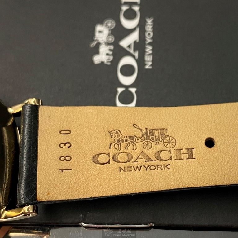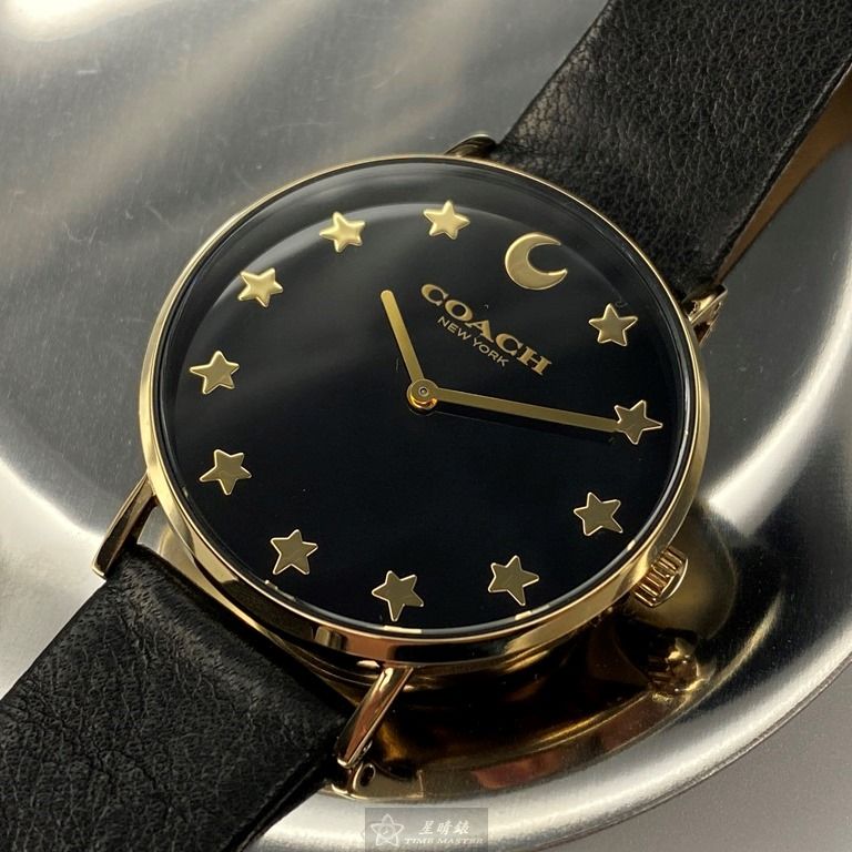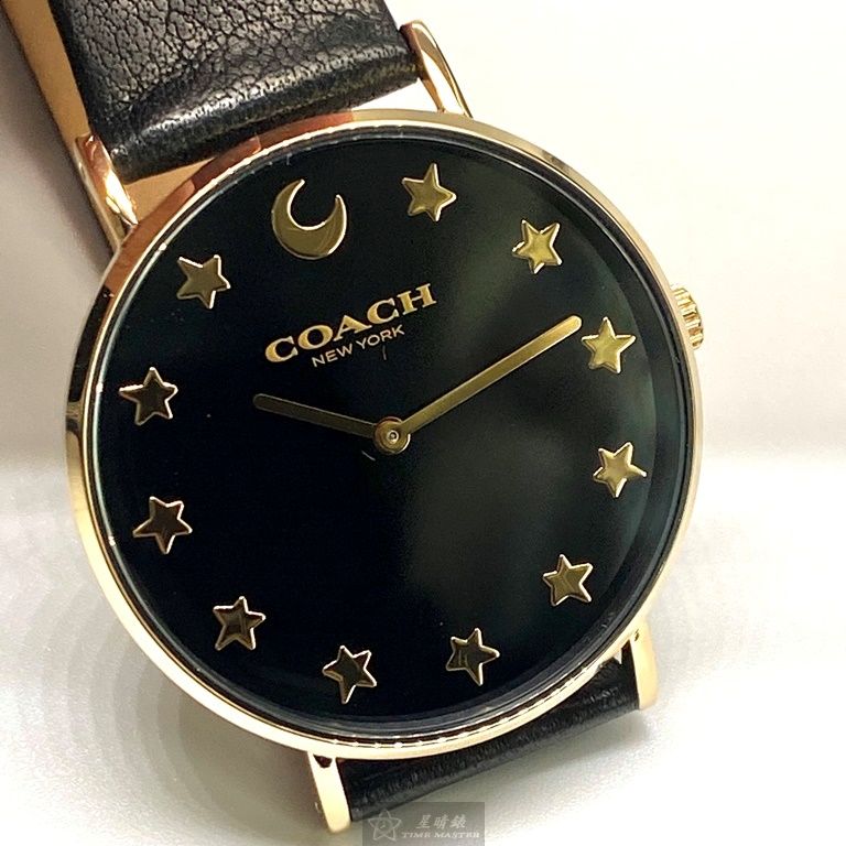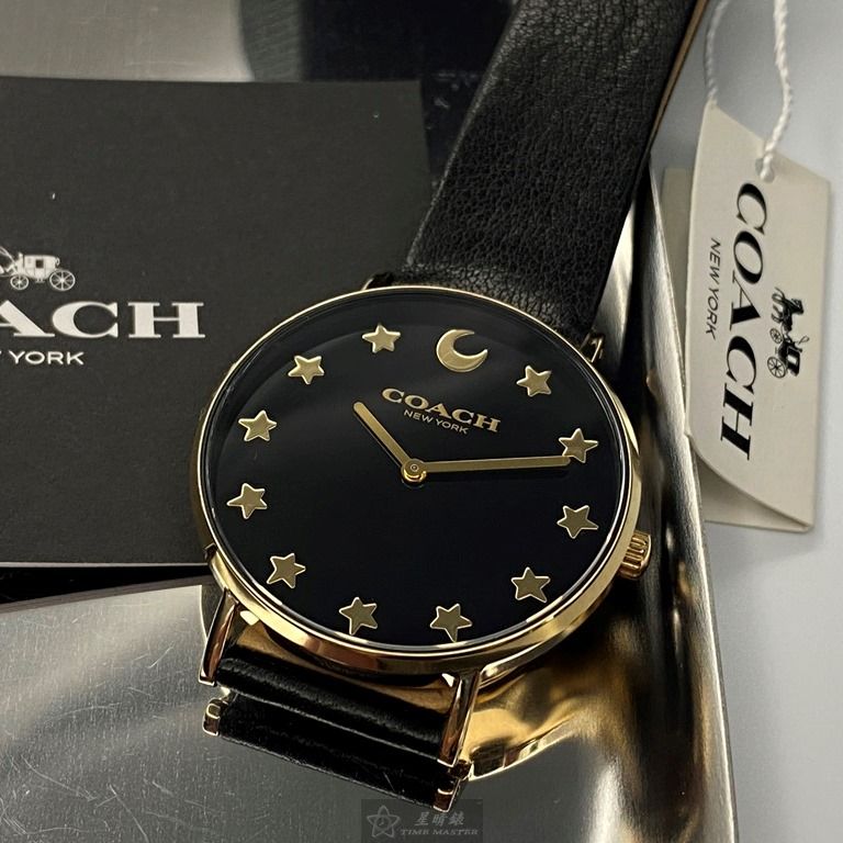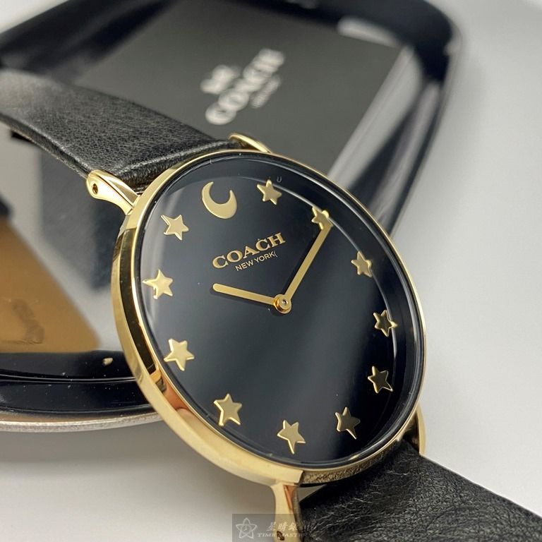 COACH蔻馳女錶,編號CH00006,36mm金色圓形精鋼錶殼,黑色簡約, 星月錶面,深黑色真皮皮革錶帶款,星月特別款