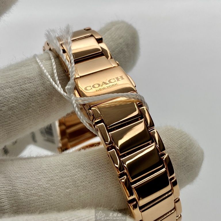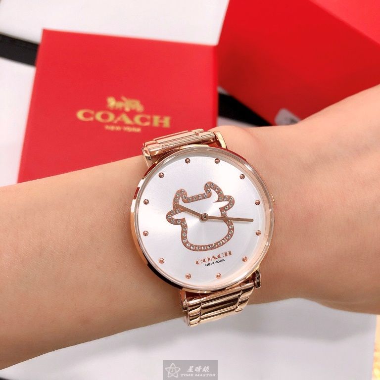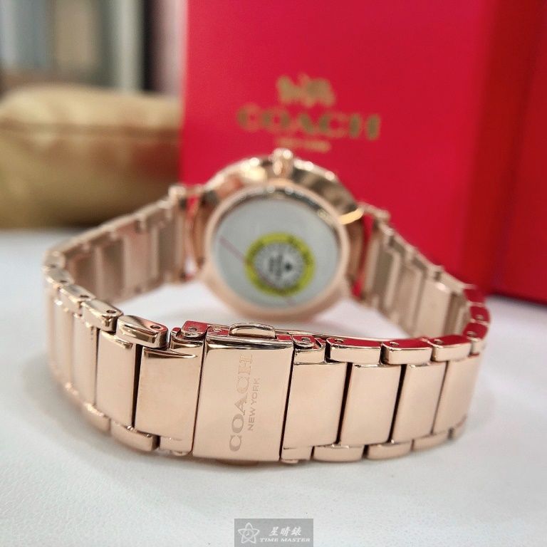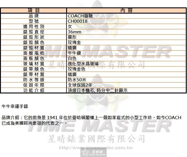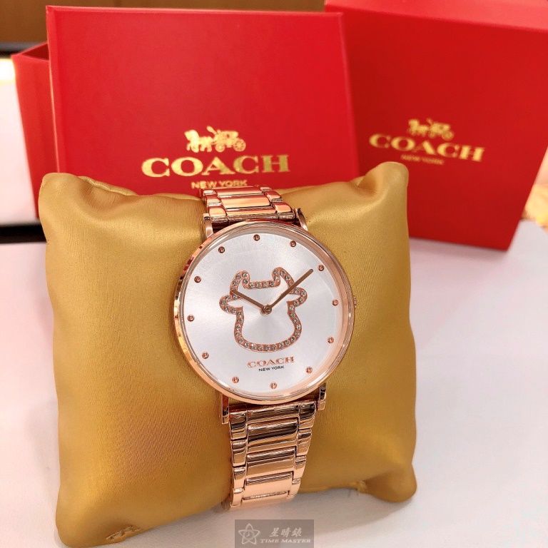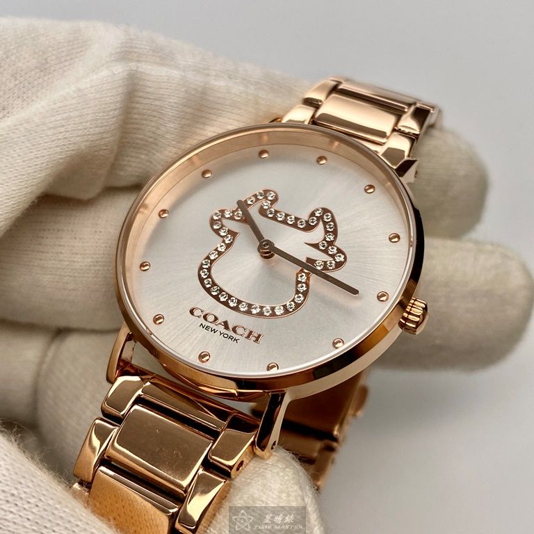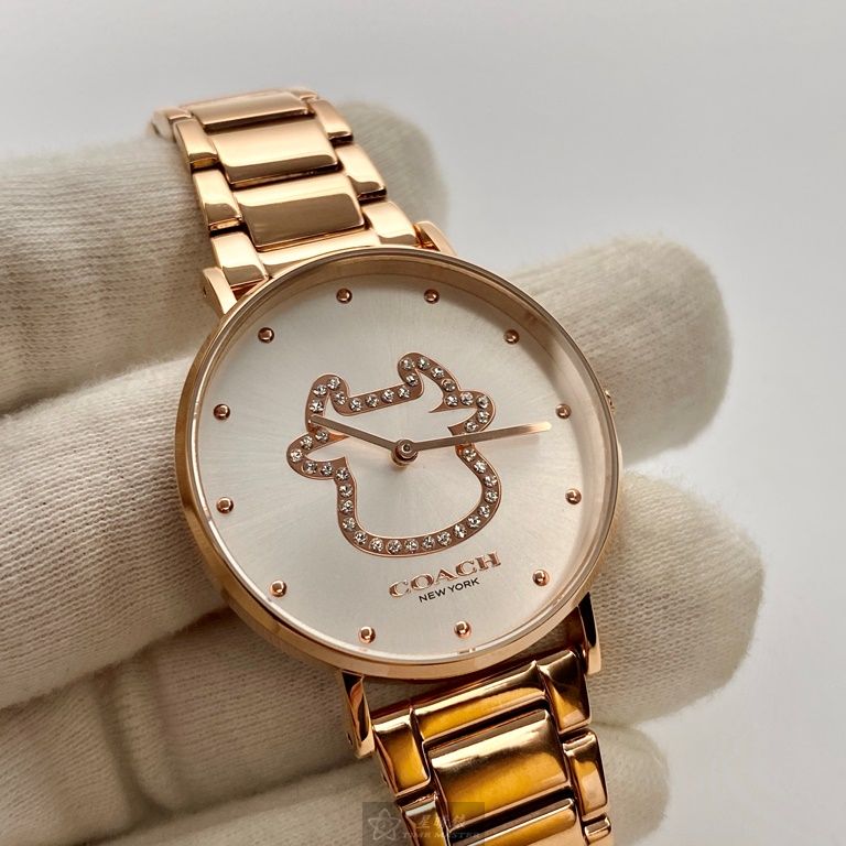 COACH蔻馳女錶,編號CH00018,36mm玫瑰金圓形精鋼錶殼,白色牛牛鑽錶面,玫瑰金色精鋼錶帶款,股市牛市好運到!