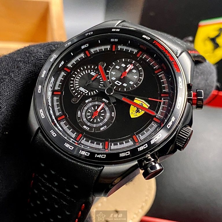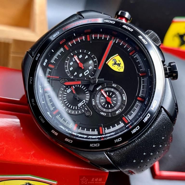 FERRARI手錶,編號FE00045,46mm黑圓形精鋼錶殼,黑色三眼, 中三針顯示, 運動錶面,深黑色真皮皮革錶帶款