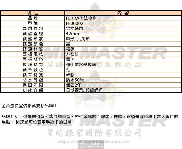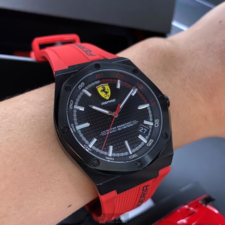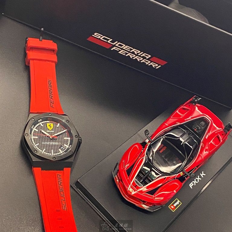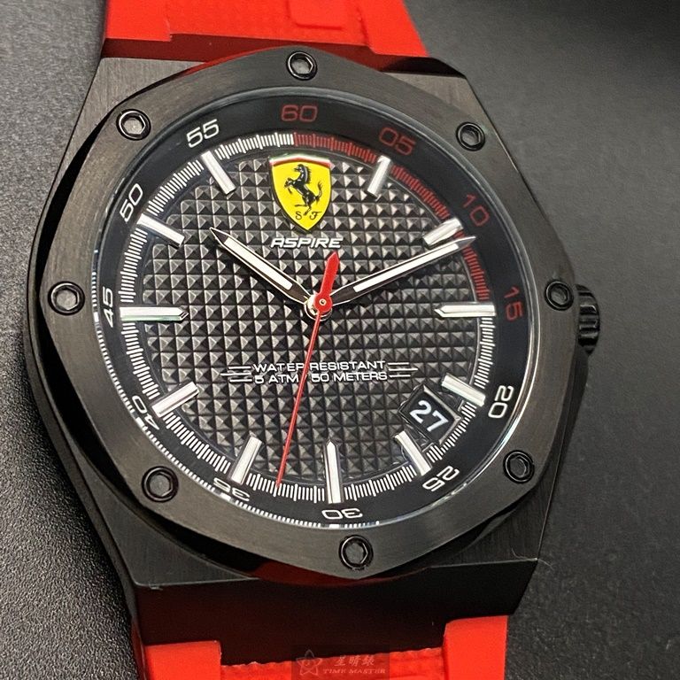 FERRARI法拉利男女通用錶,編號FE00002,42mm黑圓形, 八角形精鋼錶殼,黑色方格紋錶面,紅矽膠錶帶款