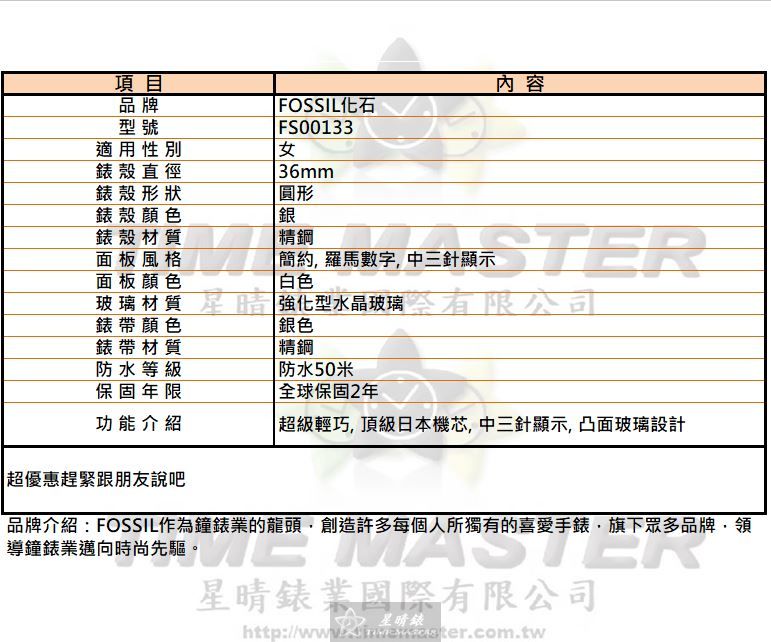 FOSSIL化石 FS00133 女錶 36mm,以精鋼錶殼搭配銀色錶帶,呈現一種安靜卻有力量的美感。 星晴錶業深知這款腕錶不是世界上最昂貴的,但每一處金屬打磨、每一片玻璃弧度,都是對品質的誠實堅持。 白色面盤與羅馬數字設計,讓時間的流轉變得優雅而從容,簡約卻不平凡。 採用日本石英機芯,穩定走時,不誇張也不妥協,只為讓每一分每一秒更準確。 凸面強化水晶玻璃反射柔光,如同女性內斂的光芒,低調卻讓人無法忽視。 36mm的圓形錶殼貼合手腕,重量恰好,佩戴一整天也不感壓力。 銀色精鋼錶帶展現堅毅與柔韌並存的質地,耐用與時尚在此取得平衡。 防水50米的設計,讓日常的洗手與生活無須過度擔憂,是實用與美感的雙重承諾。 星晴錶業不追求浮華,只堅守「好錶應該可靠」的信念,讓每位佩戴者都能安心相伴。 FOSSIL FS00133 女錶,是一種責任感的展現——不只是銷售商品,而是將時間以誠實的方式呈現給懂生活的妳。
