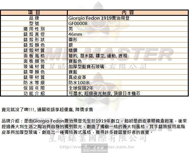 Giorgio Fedon 1919喬治飛登男錶,編號GF00008,46mm銀錶殼,寶藍錶帶款
