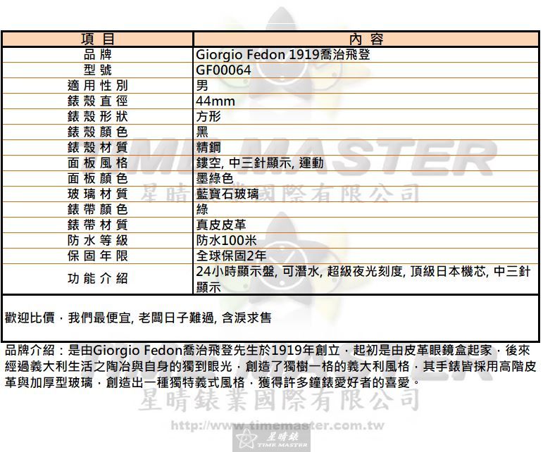 GiorgioFedon1919手錶,編號GF00064,44mm黑錶殼,綠錶帶款