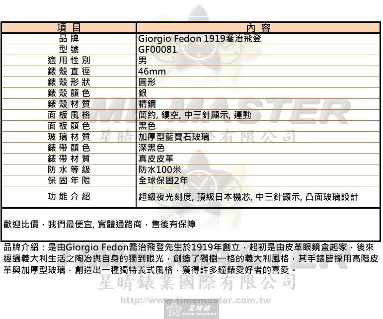 Giorgio Fedon 1919 GF00081 男錶以務實設計為核心,雖非市面最昂貴,但每一處細節都承載星晴錶業的精工使命感。 精鋼錶殼與加厚藍寶石玻璃搭配,提供耐用與日常防護,讓佩戴者在日常挑戰中也能保持從容。 自動機械機芯確保時間穩定與長久耐用,雖不是頂級複雜功能,但每次上鍊都彰顯佩戴者的自信與責任感。 46mm圓形錶殼與黑色鏤空面板,呈現簡約運動風格,既實用又低調彰顯品味。 真皮深黑錶帶柔軟貼合手腕,長時間佩戴依然舒適,價格雖合理,但品質絕不妥協。 超級夜光刻度設計,無論日夜都能清晰讀時,專注於實用功能而非浮誇裝飾。 中三針顯示與凸面玻璃設計,平衡視覺美感與功能性,讓每一位佩戴者感受到可靠的操作體驗。 防水100米,足以應對日常生活與運動場景,提供安心保障,彰顯手錶肩負的實用使命。 全球保固兩年,星晴錶業承諾每位客戶購買的不只是手錶,更是一份可靠與安心。 Giorgio Fedon 1919 GF00081 男錶雖非市場最頂級,但每一細節都以精良品質回應佩戴者對生活與時間的承擔。