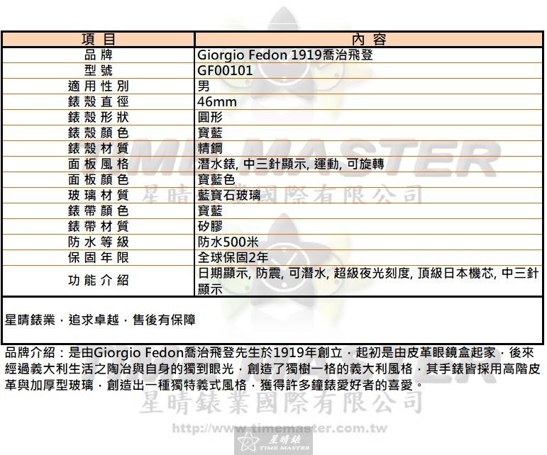 這裡是可直接複製的文案內容: --- 在星晴錶業,我們明白這款 Giorgio Fedon 1919 GF00101 不是追求浮誇名氣的作品,而是以務實可靠為使命的男錶。 它以46mm精鋼寶藍錶殼呈現沉著存在感,沒有誇張的宣稱,只把材質做到穩定與耐用。 藍寶石玻璃的加入,是希望每天佩戴時,你能少一些刮痕困擾,多一些安心。 寶藍色矽膠錶帶貼合手腕,沒有花俏的噱頭,只有耐用、舒適與能陪你久一點的誠意。 自動機械機芯雖不是最高階規格,但以日本頂級機芯穩定著稱,能讓時間走得踏實、可靠。 運動潛水風格的面板設計著重清晰可讀,夜光刻度在暗處也盡責地陪你看清時間。 500米防水不是炫技,而是把耐用當成商品該盡的本分,為你的日常與挑戰提供保障。 日期顯示功能不追求複雜,只為在繁忙的生活裡給你一個實用的小提醒。 全球保固2年讓這款錶的品質不只停留在話語,而是願意以承諾來背書。 價格或許不是最低,但 GF00101 以誠實材質與紮實規格,完成了它作為一只好用男錶的使命。 ---