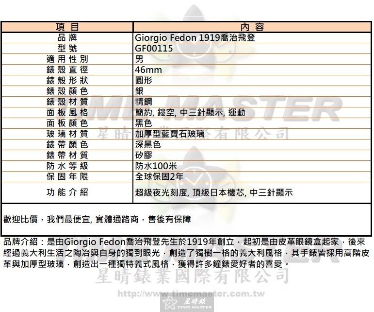 Giorgio Fedon 1919喬治飛登GF00115男錶以精鋼錶殼搭配深黑色矽膠錶帶,呈現低調卻不失運動感的質感。 自動機械機芯提供穩定走時,即便不是頂級款,也能滿足日常與專業需求。 黑色鏤空面板搭配簡約中三針設計,讓時間顯示清晰直觀,細節處彰顯精工精神。 加厚藍寶石玻璃保障錶面耐刮耐磨,為每一次佩戴提供可靠防護。 錶徑46mm適合男性手腕比例,佩戴舒適且展現個人風格,兼具運動與正式場合需求。 100米防水設計支持日常游泳與淋浴,給予使用者更多生活自由度。 超級夜光刻度方便夜間辨識時間,實用性高且提升整體功能感。 頂級日本機芯雖非極致奢華,但在精準度與耐用性上表現出色,承載每日使命感。 全球保固2年提供安心保障,價格雖非最便宜,但品質穩定值得信賴。 每一只GF00115都是細膩務實的選擇,肩負時間守護的使命,讓佩戴者感受可靠與自信。