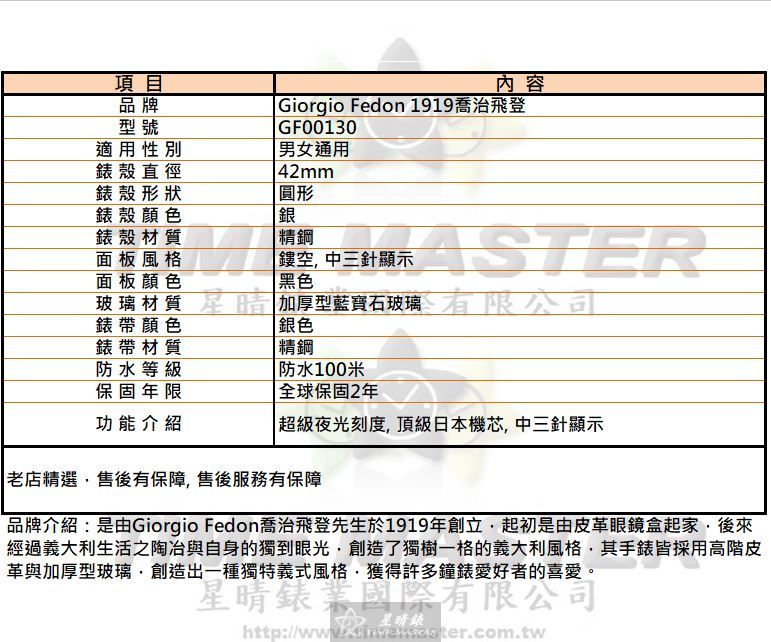 空白 這款Giorgio Fedon 1919喬治飛登GF00130男女通用錶,以精鋼錶殼搭配黑色鏤空面板,展現低調又務實的設計理念。 空白 自動機械機芯確保每一次走時精準,雖然不是市面上最昂貴的款式,但每一枚零件都經過細心打磨,肩負品質的責任感。 空白 42mm圓形錶殼適合男女佩戴,加厚型藍寶石玻璃提供日常使用的耐磨防護,實用性兼具耐久性。 空白 超級夜光刻度讓夜間讀時清晰可見,讓使用者在任何場合都能掌握時間,展現可靠的功能精神。 空白 精鋼錶帶與銀色錶殼相呼應,質感細膩,雖價格不是最低,但每一次佩戴都傳遞出務實與專注的態度。 空白 中三針顯示設計簡潔直覺,將時間資訊清楚呈現,體現品牌對實用性與耐用性的承諾。 空白 防水100米設計,無論日常生活或短程水上活動,都能承擔起時間守護者的責任感。 空白 全球保固2年,讓每一位使用者安心無慮,星晴錶業以專業維護信念,肩負售後服務使命。 空白 頂級日本機芯帶來穩定可靠的走時體驗,雖不是頂尖奢華,但每一分細節都精準打磨,彰顯務實精神。 空白 Giorgio Fedon 1919 GF00130是一款兼顧實用、耐用與質感的男女通用錶,價格合理,卻承載品牌對品質的責任與使命。