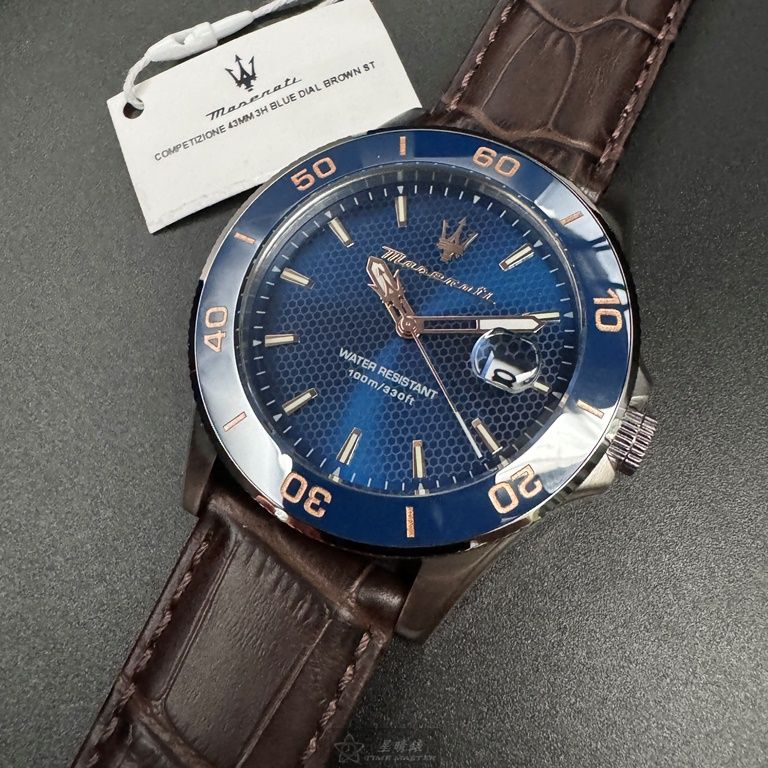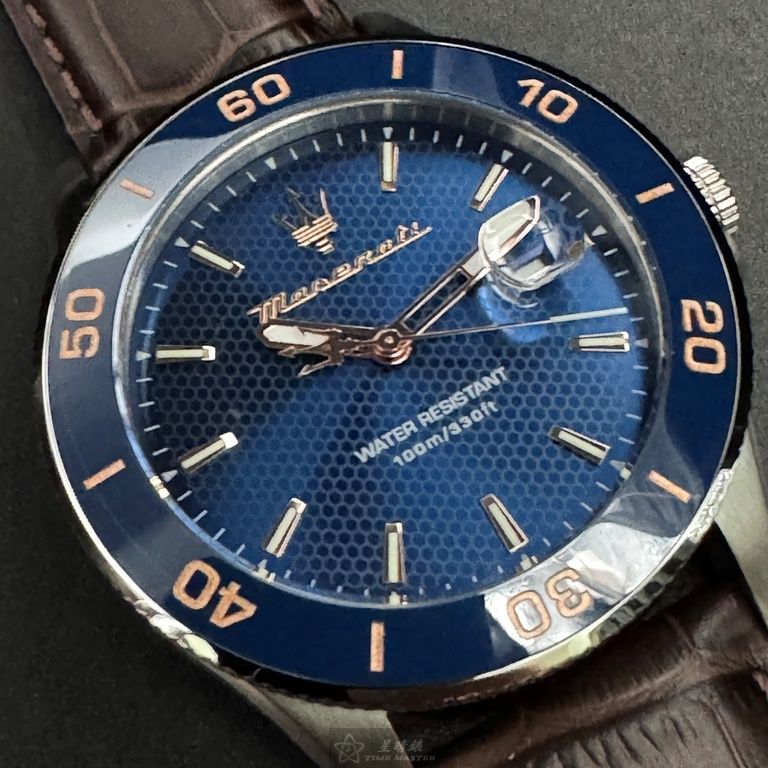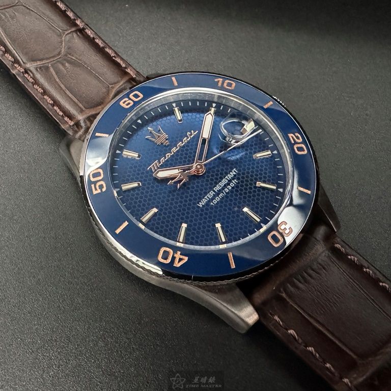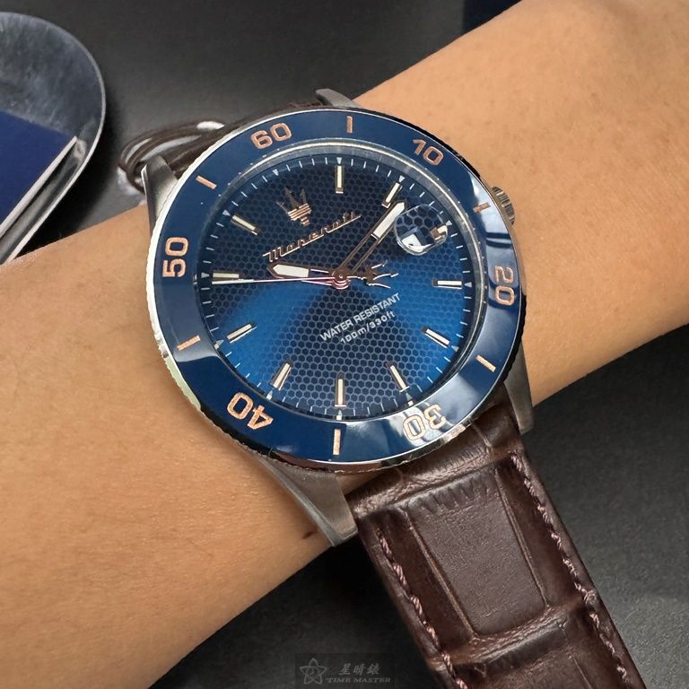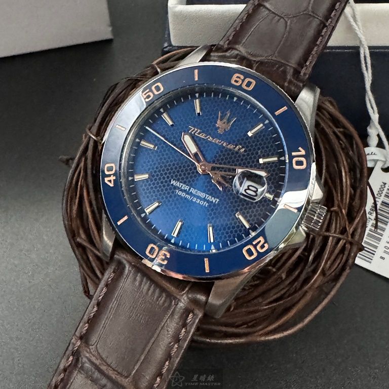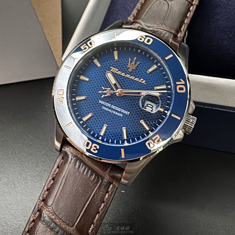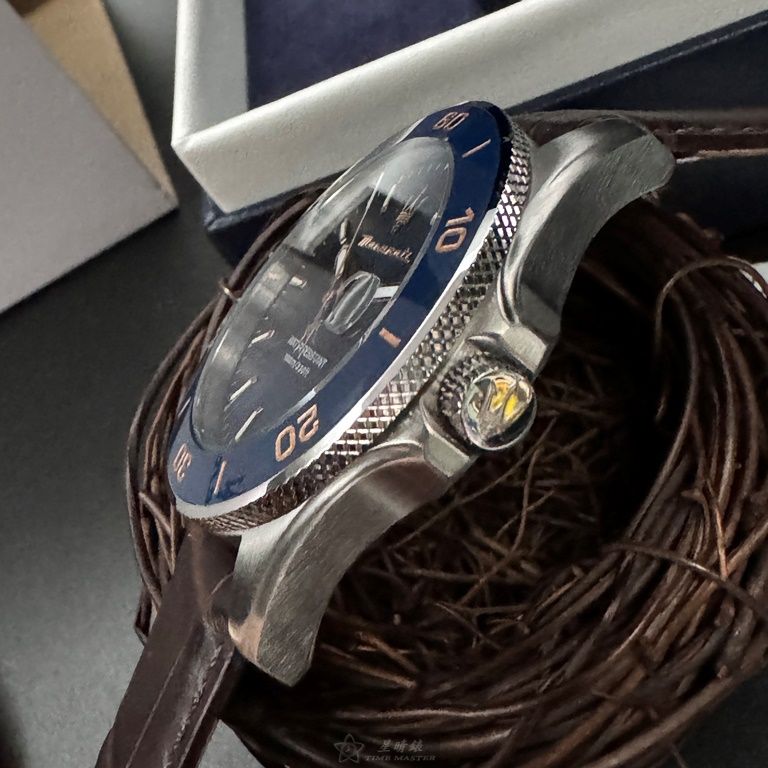 MASERATI手錶,編號R8851100004,44mm寶藍錶殼,咖啡色錶帶款
