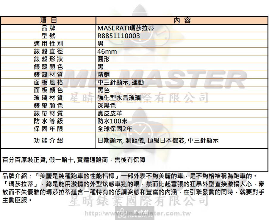 MASERATI手錶,編號R8851110003,46mm黑錶殼,深黑色錶帶款