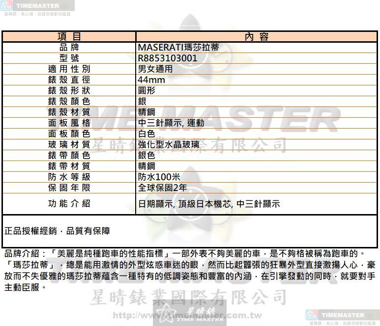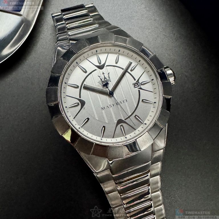 MASERATI手錶,編號R8853103001,44mm銀圓形精鋼錶殼,白色中三針顯示, 運動錶面,銀色精鋼錶帶款