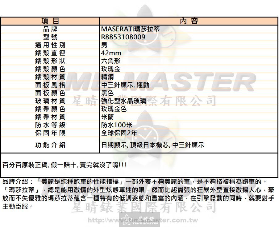 MASERATI手錶,編號R8853108009,42mm玫瑰金錶殼,玫瑰金色錶帶款