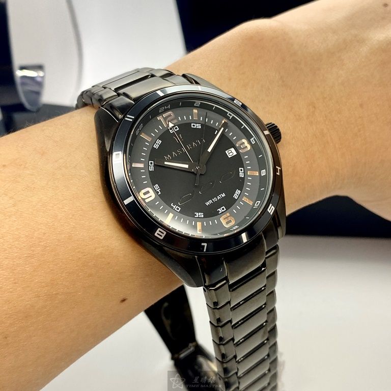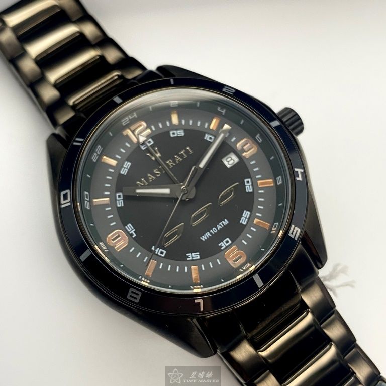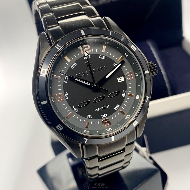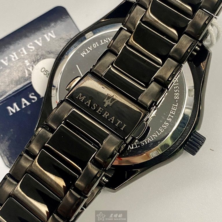 MASERATI手錶,編號R8853124001,46mm黑圓形精鋼錶殼,黑色運動, 中四針顯示錶面,深黑色精鋼錶帶款