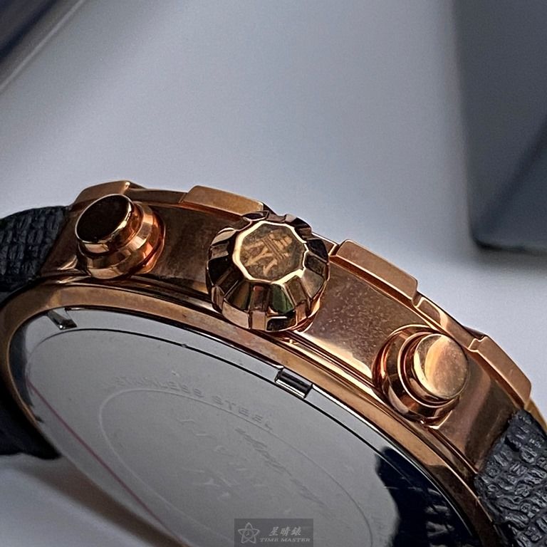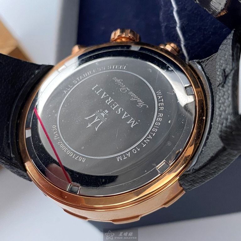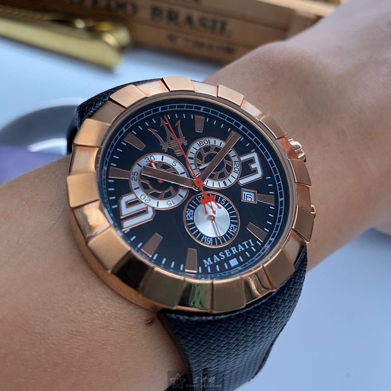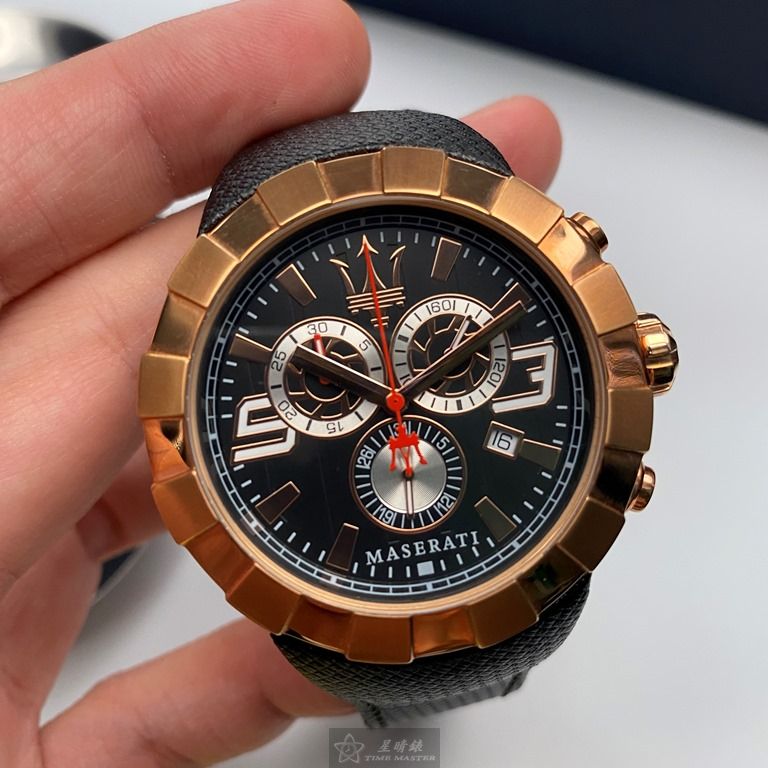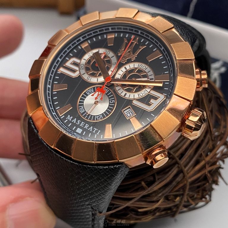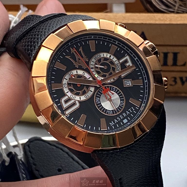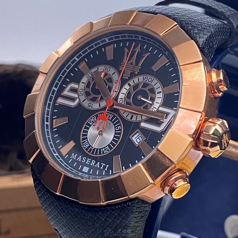 MASERATI手錶,編號R8871603002,44mm玫瑰金圓形精鋼錶殼,黑色三眼, 運動錶面,深黑色真皮皮革錶帶款