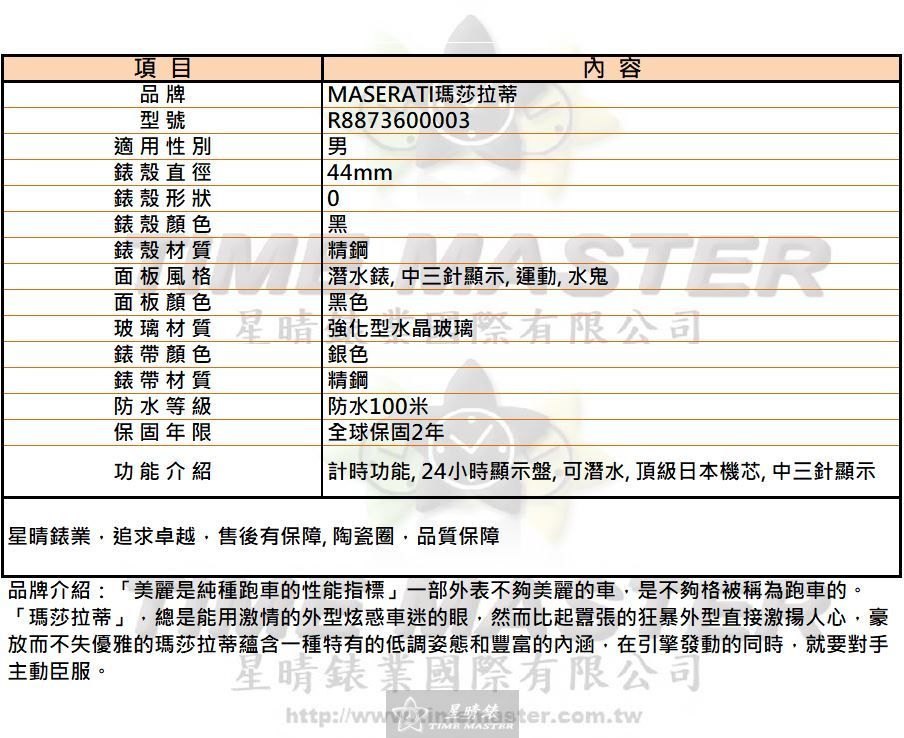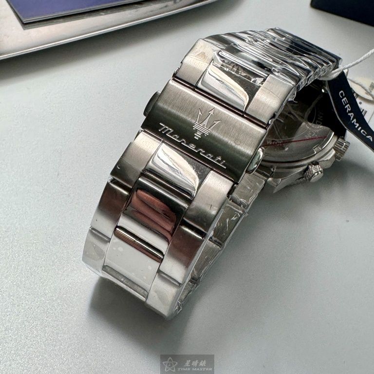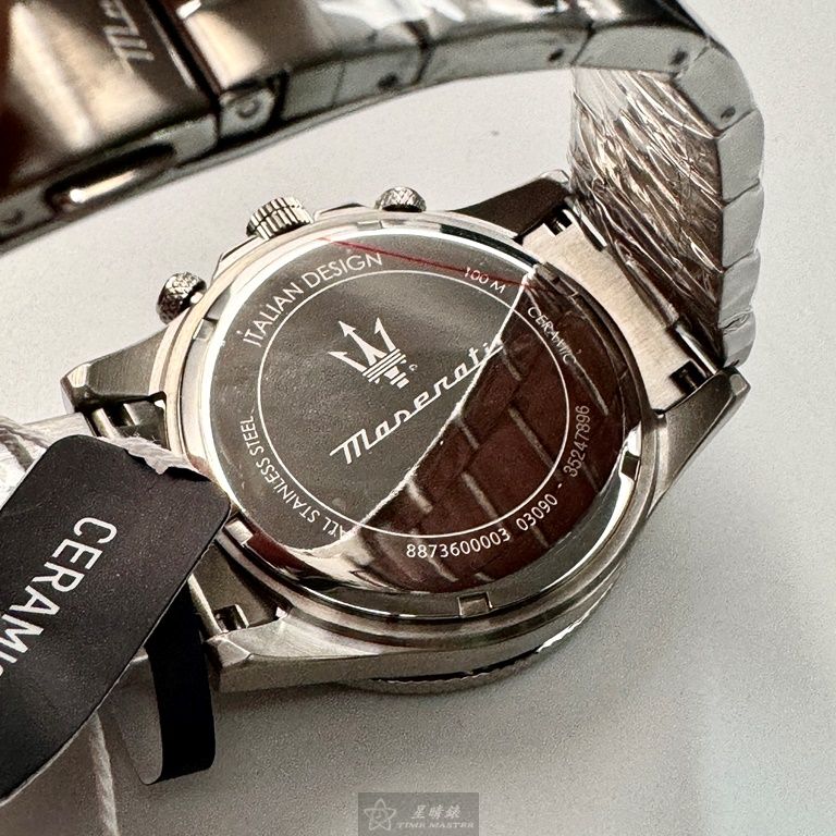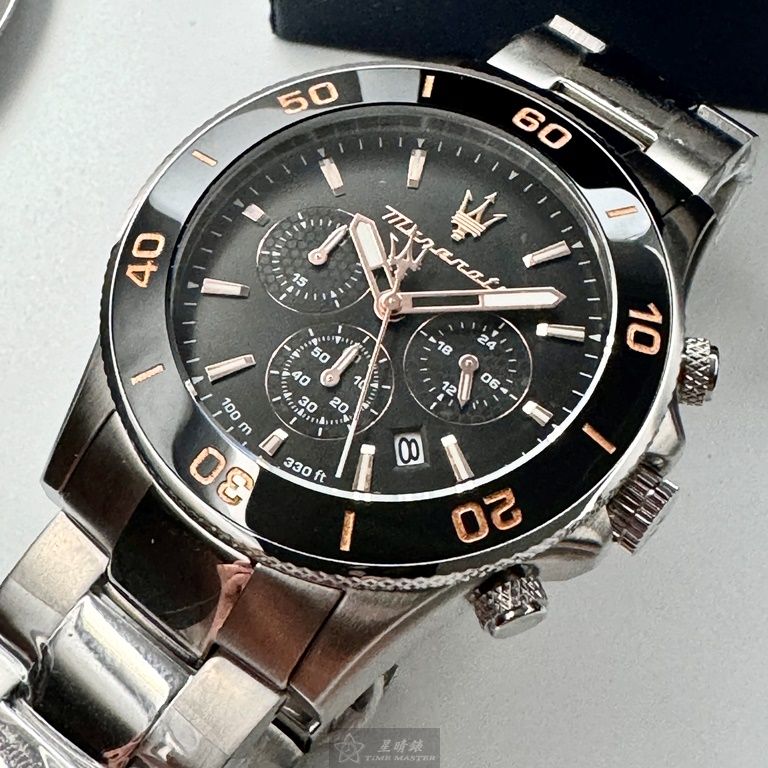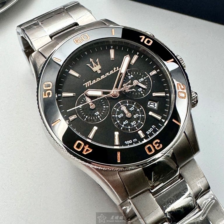 MASERATI手錶,編號R8873600003,44mm黑錶殼,銀色錶帶款